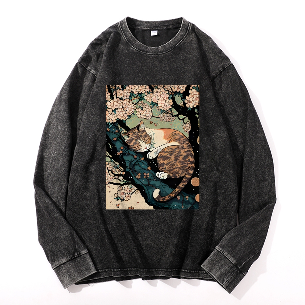 Sleeping Cat Deep Washed Vintage Long Sleeves T-Shirt