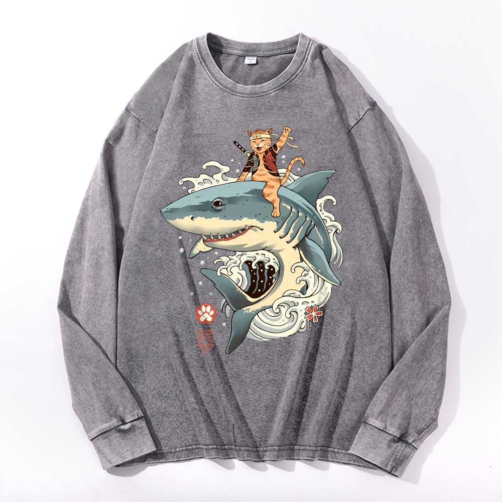 Shark Sushi Cat Ukiyoe Pattern Deep Washed Vintage Long Sleeves T-Shirt
