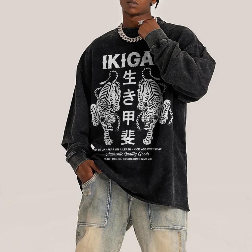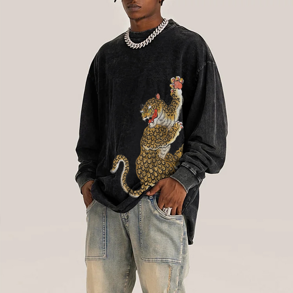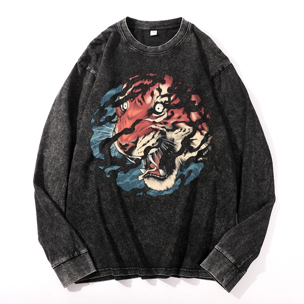 Ukiyoe Tiger Pattern Deep Washed Vintage Long Sleeves T-Shirt