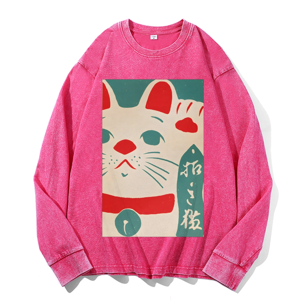 Japanese Maneki-neko Deep Washed Vintage Long Sleeves T-Shirt