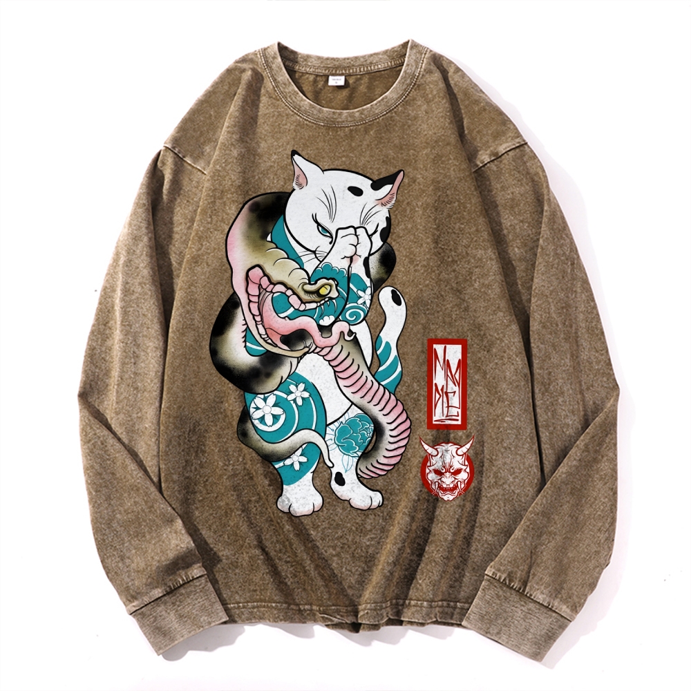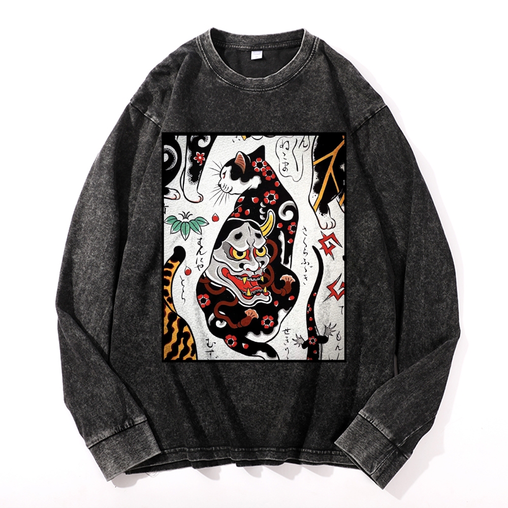 Japanese Warrior Cat Pattern Deep Washed Vintage Long Sleeves T-Shirt