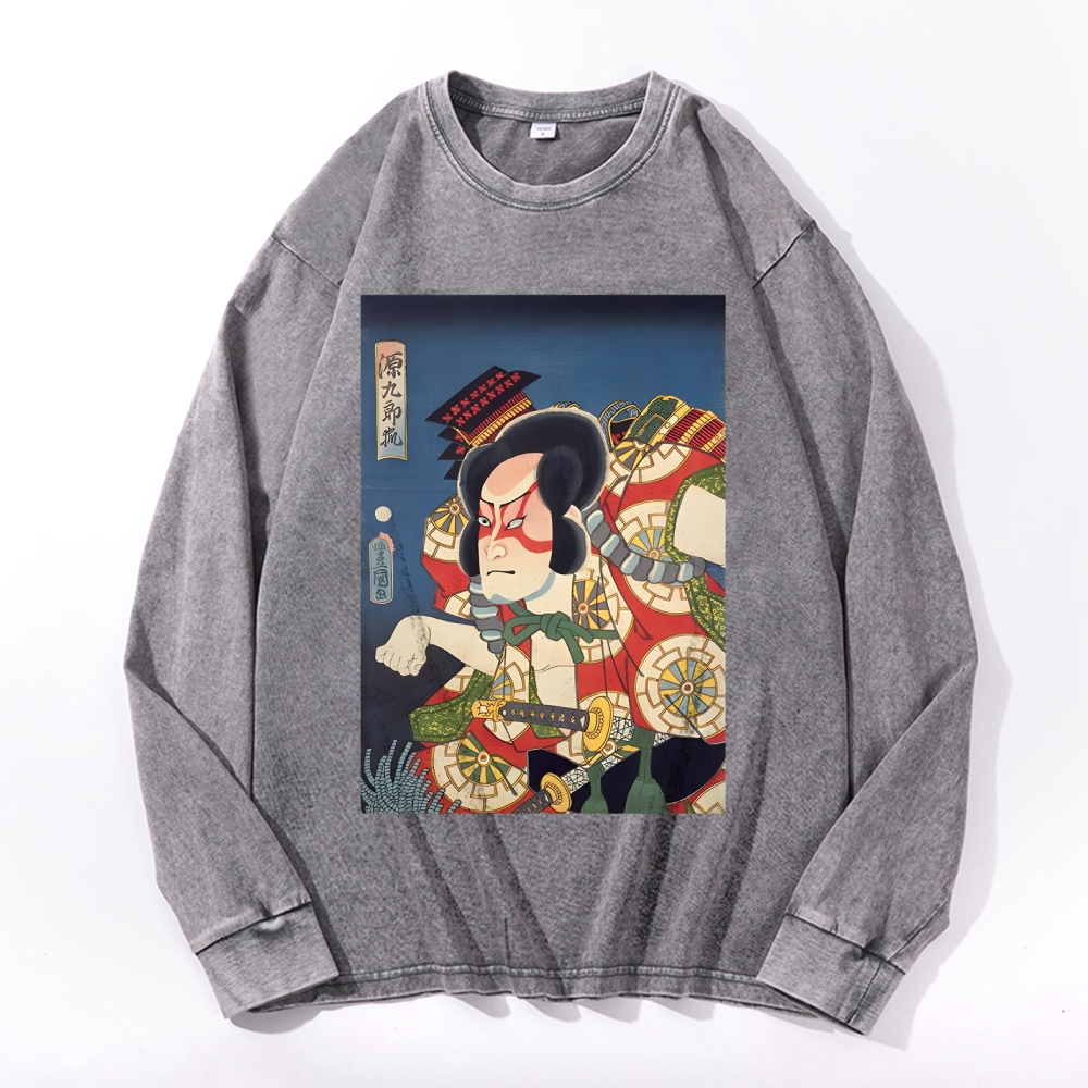 Japanese Figure Ukiyoe Pattern Deep Washed Vintage Long Sleeves T-Shirt