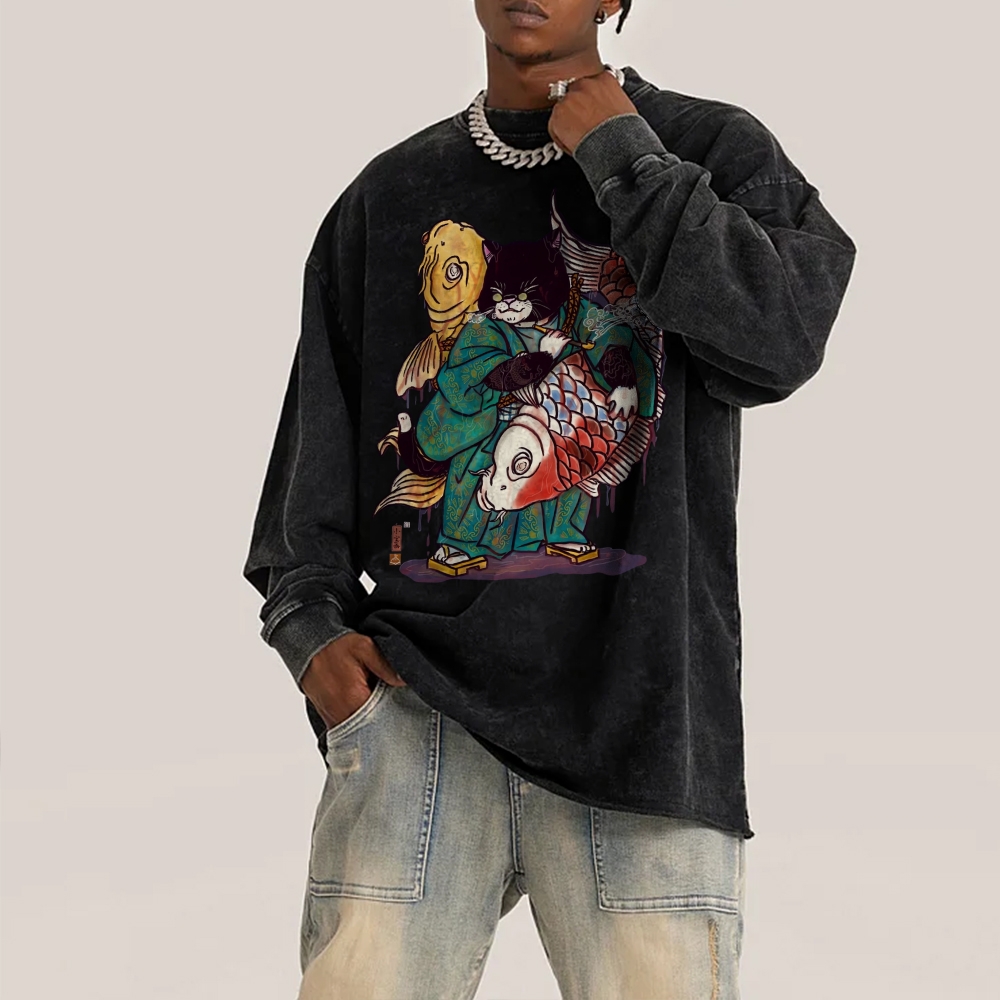 Fish Pressure Cat Deep Washed Vintage Long Sleeves T-Shirt