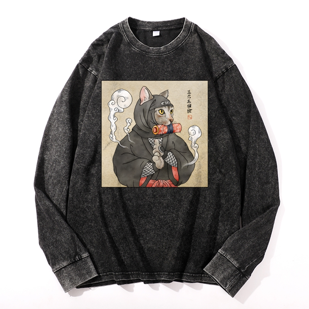 Japanese Ninja Cat Pattern Deep Washed Vintage Long Sleeves T-Shirt