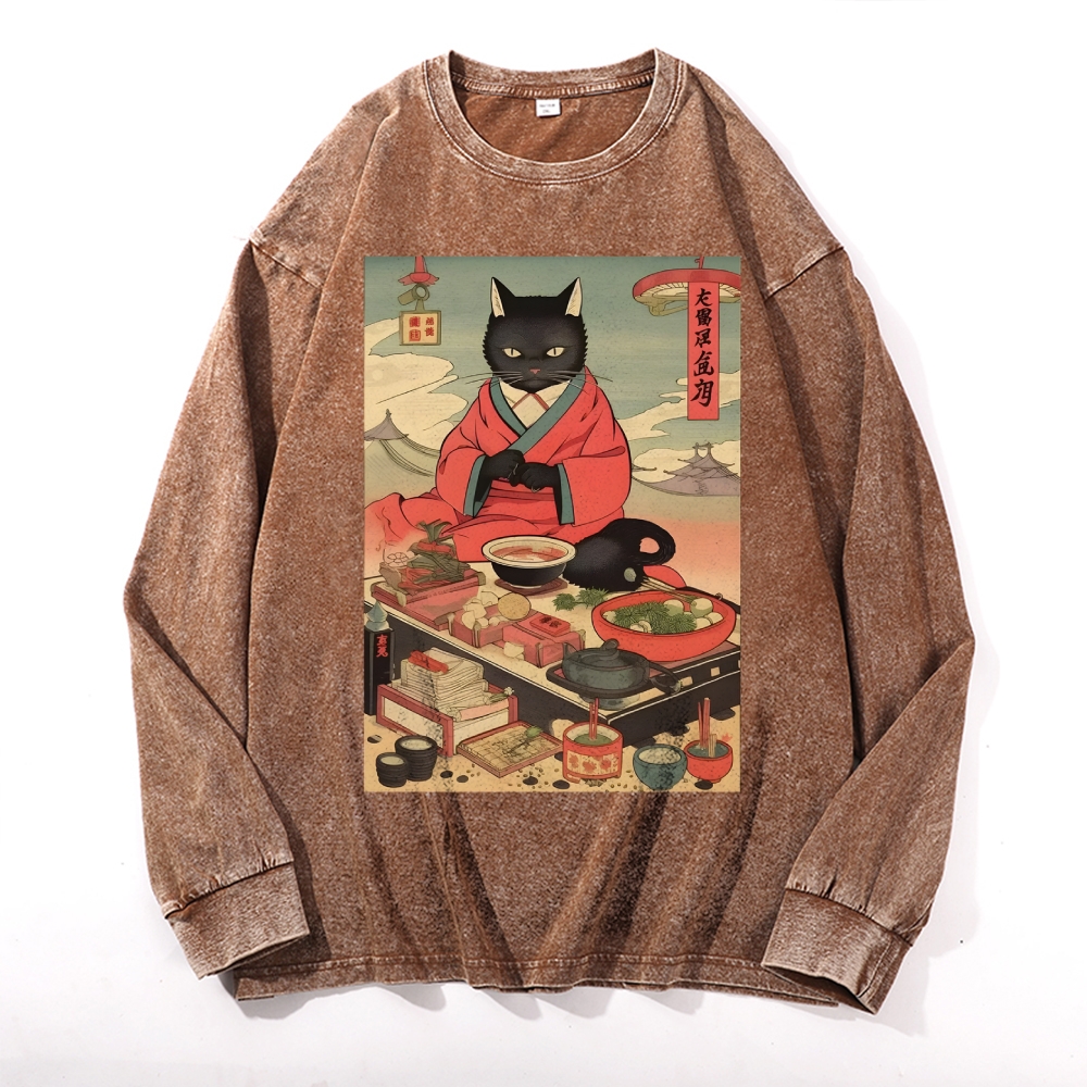 Samurai Cat Printed Casual Deep Washed Vintage Long Sleeves T-Shirt