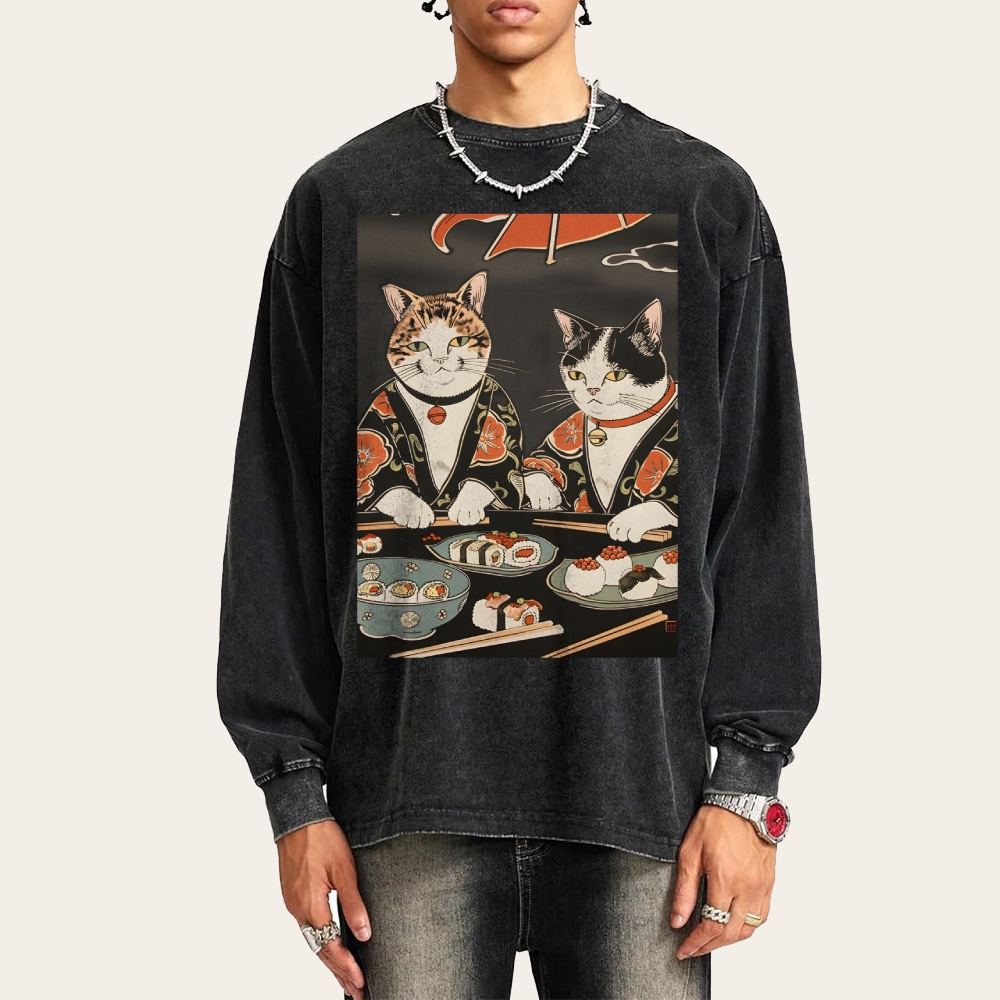 Sushi Cat Pattern Deep Washed Vintage Long Sleeves T-Shirt