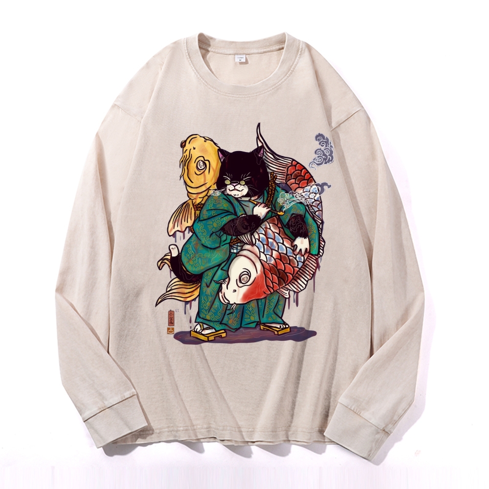 Big Fish Cat Deep Washed Vintage Long Sleeves T-Shirt