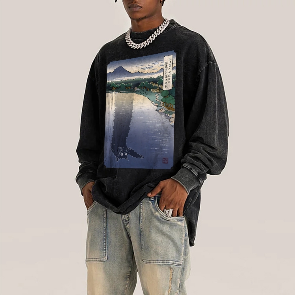 Black Cat Monster Deep Washed Vintage Long Sleeves T-Shirt