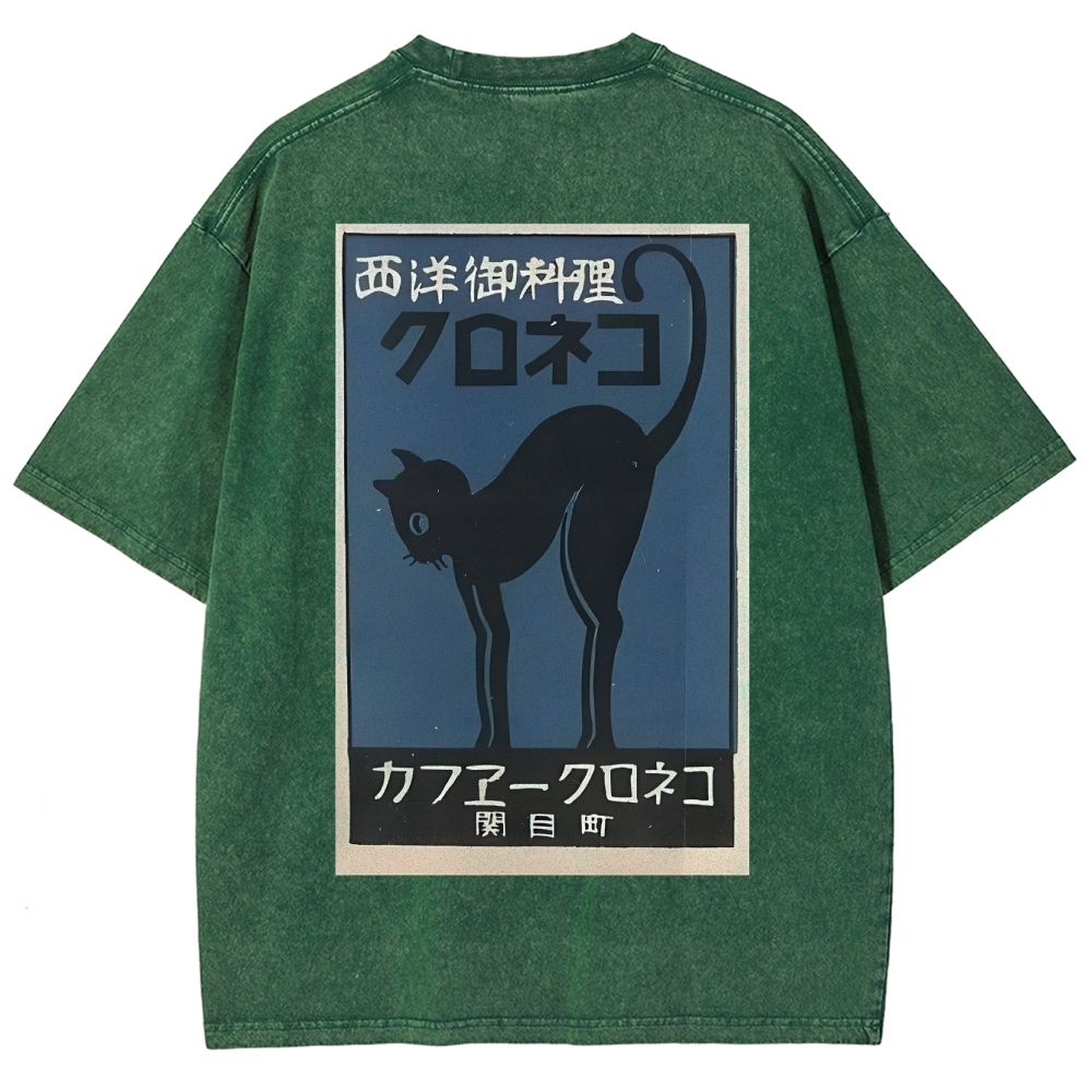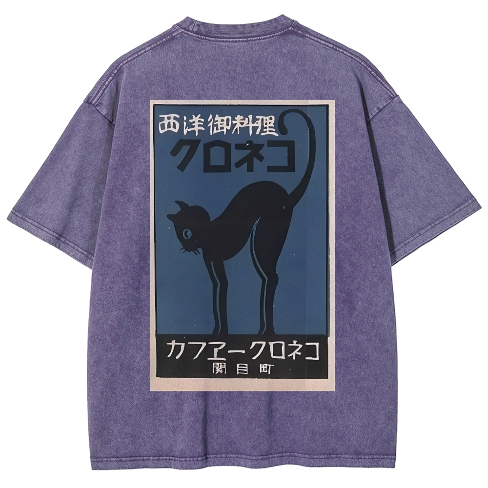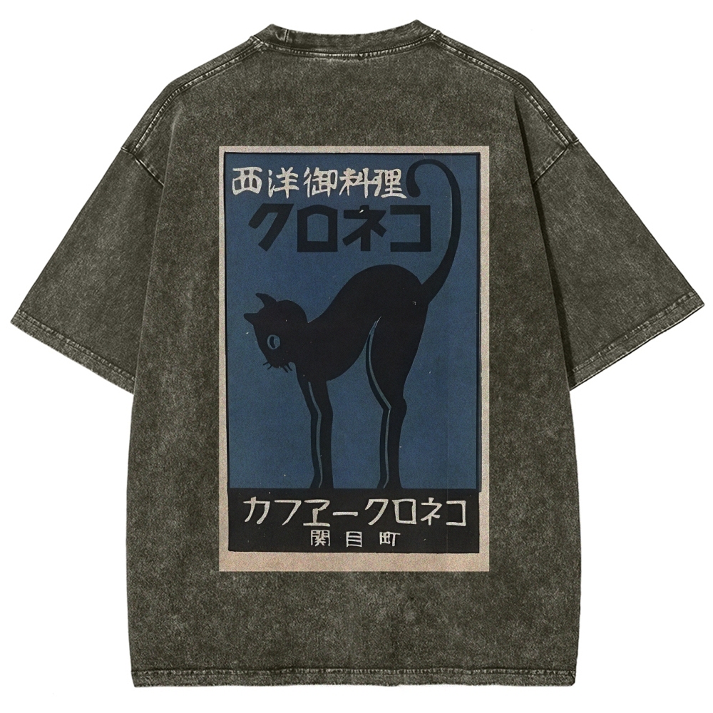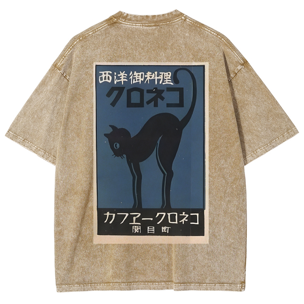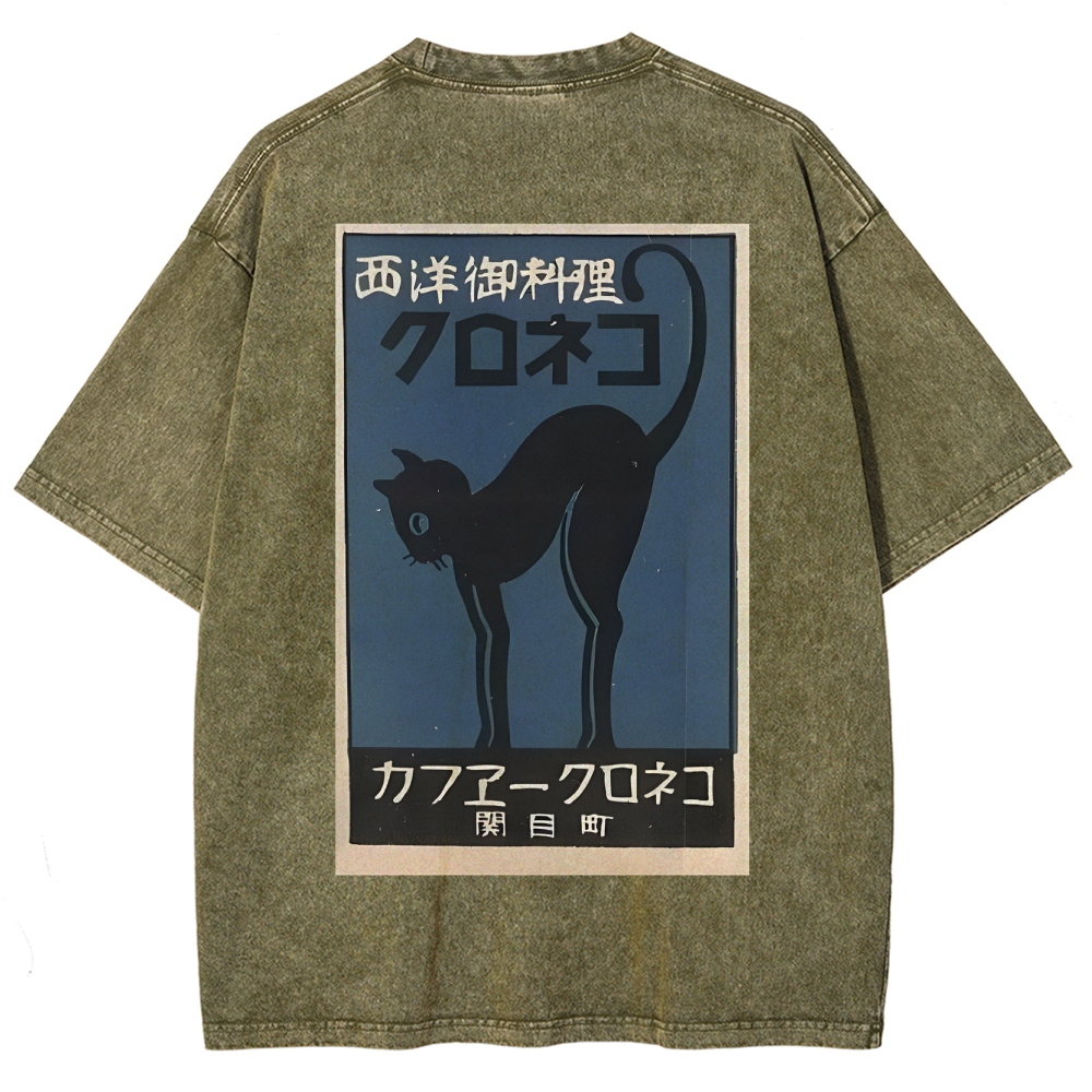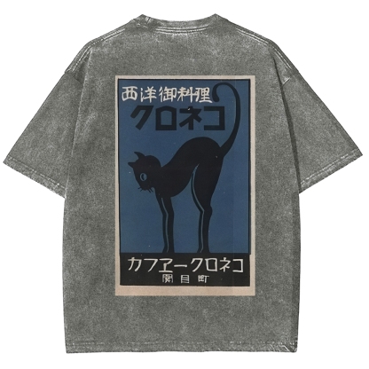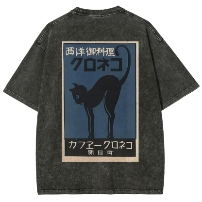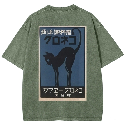 Black Cat Printed Washed Vintage Short Sleeves T-Shirt