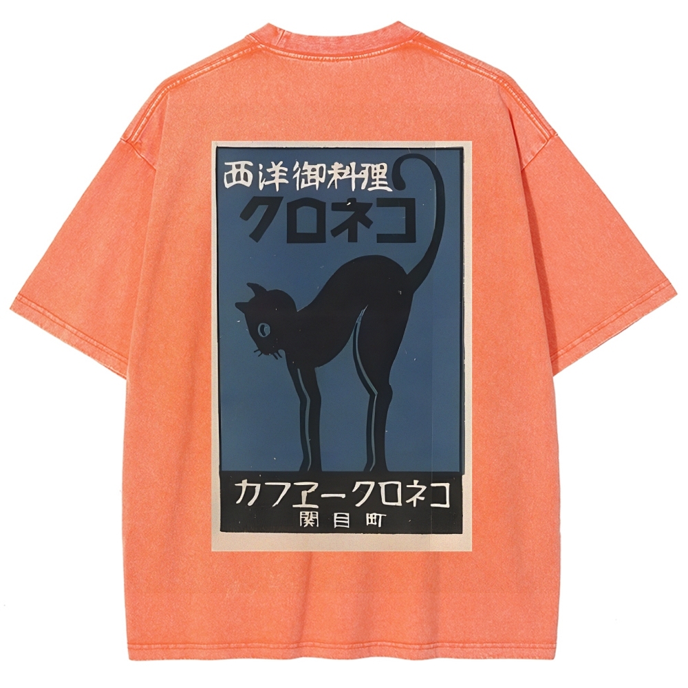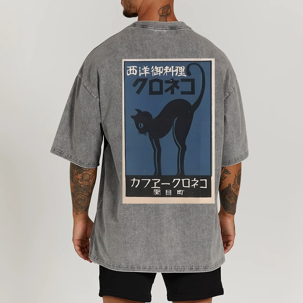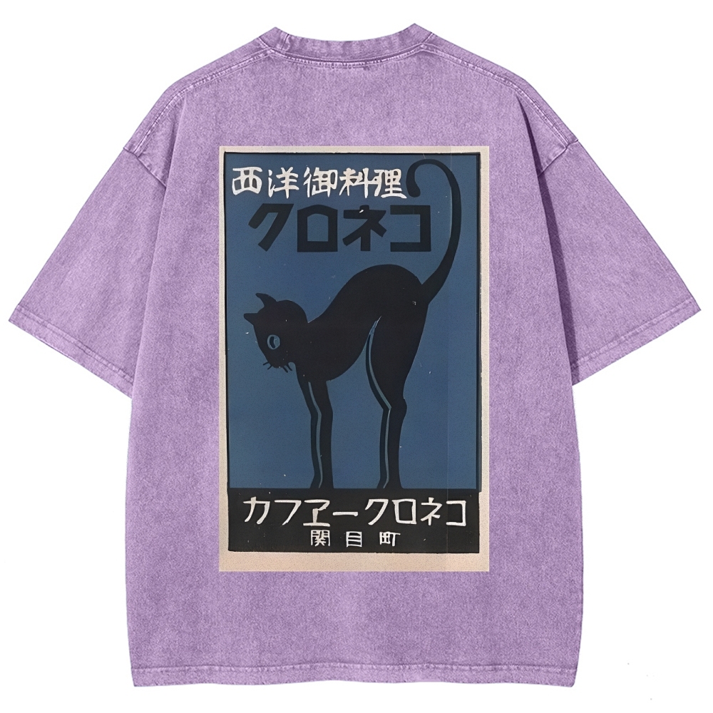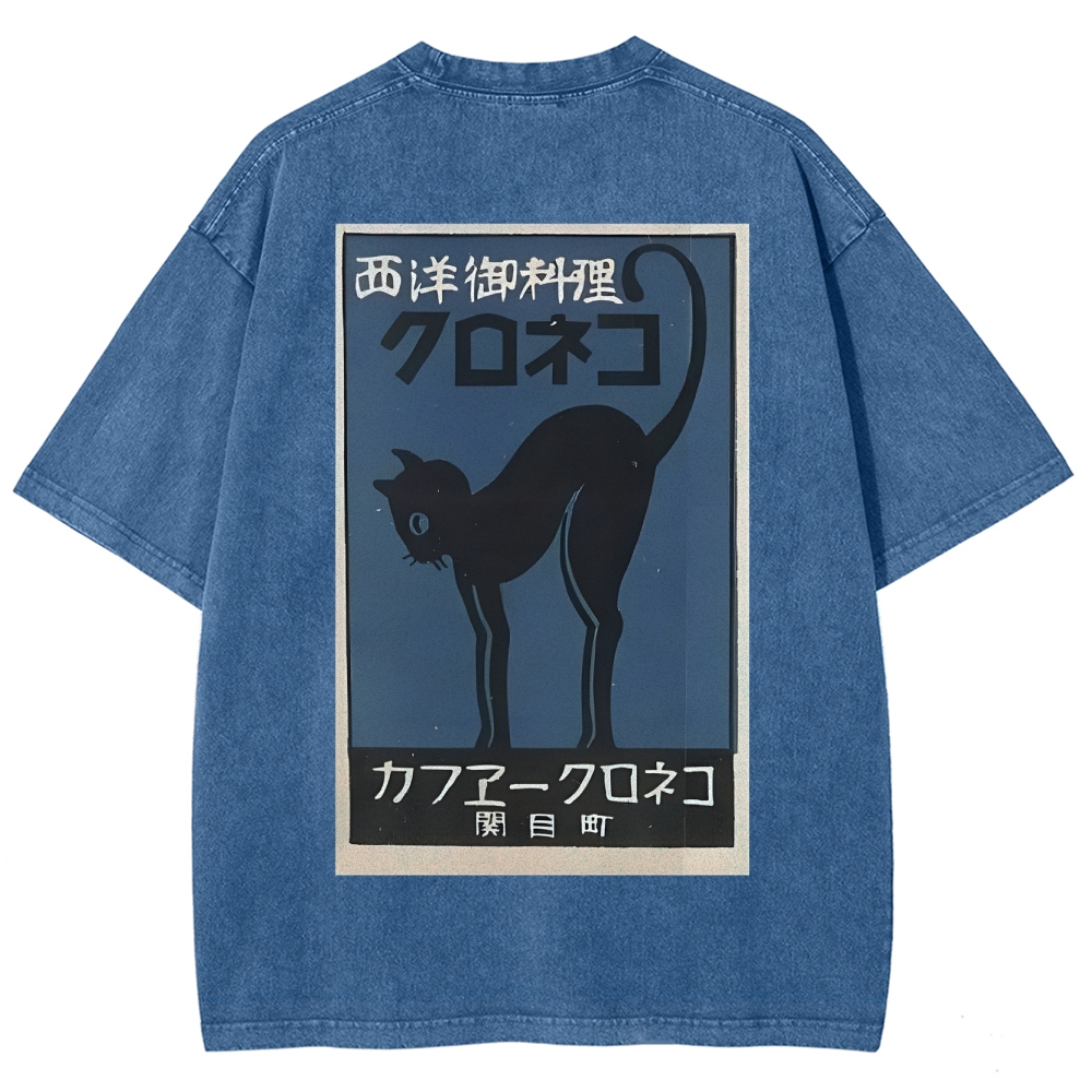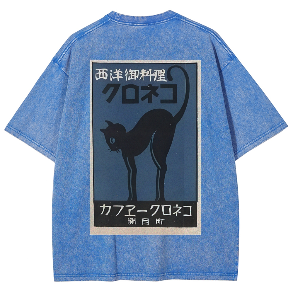 Black Cat Printed Washed Vintage Short Sleeves T-Shirt