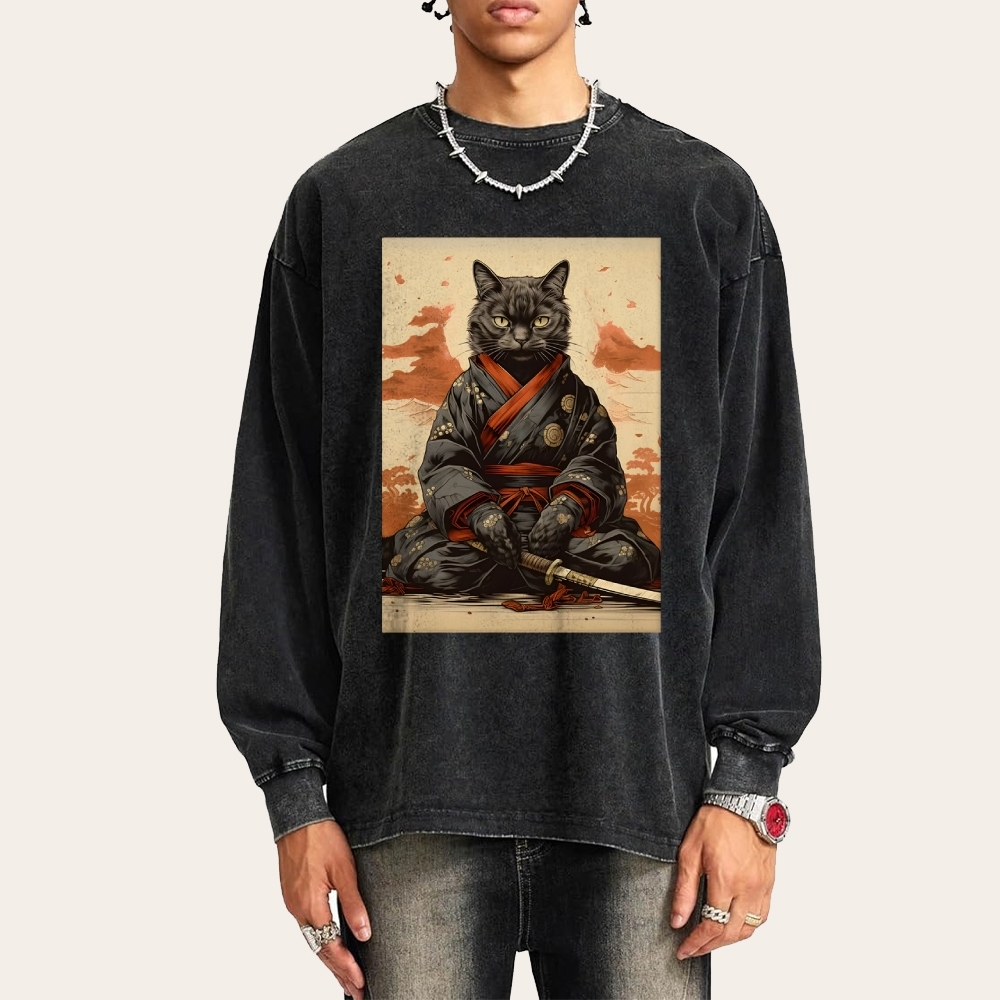 Black Cat Warrior Deep Washed Vintage Long Sleeves T-Shirt