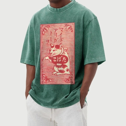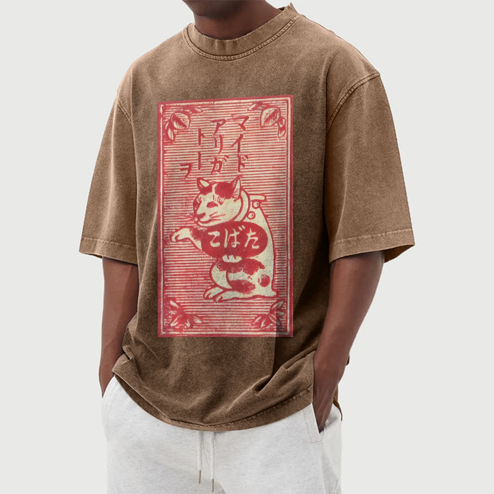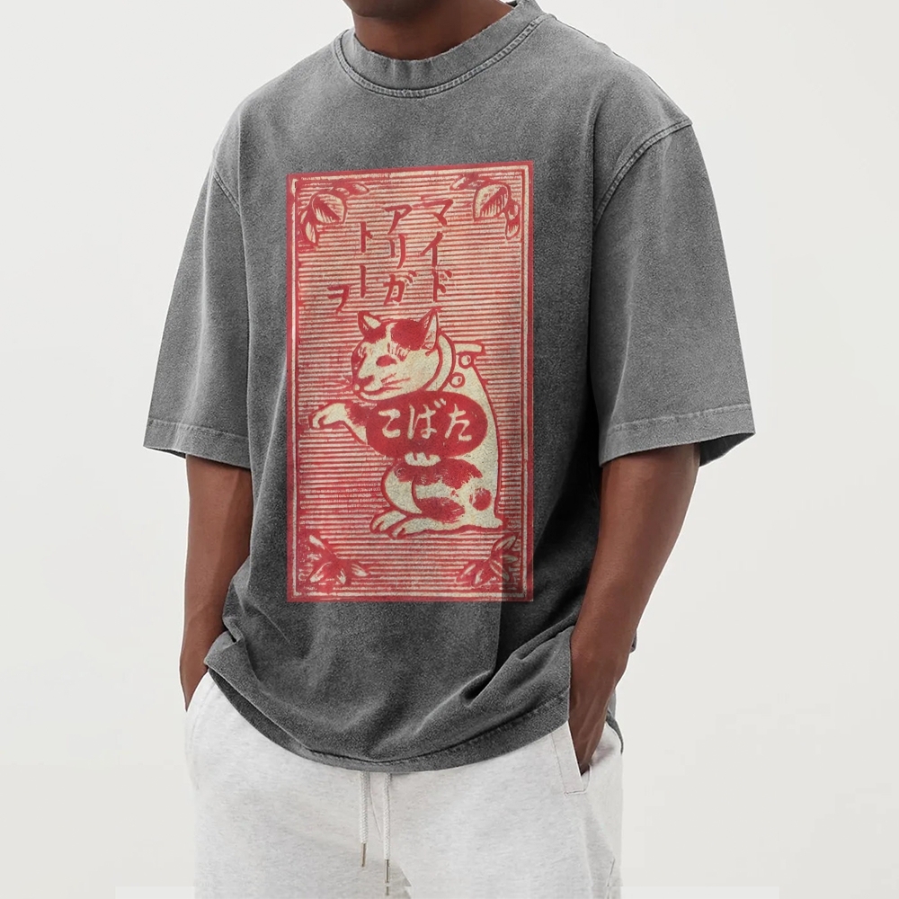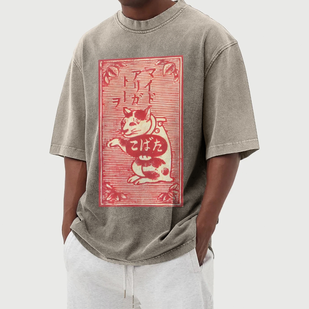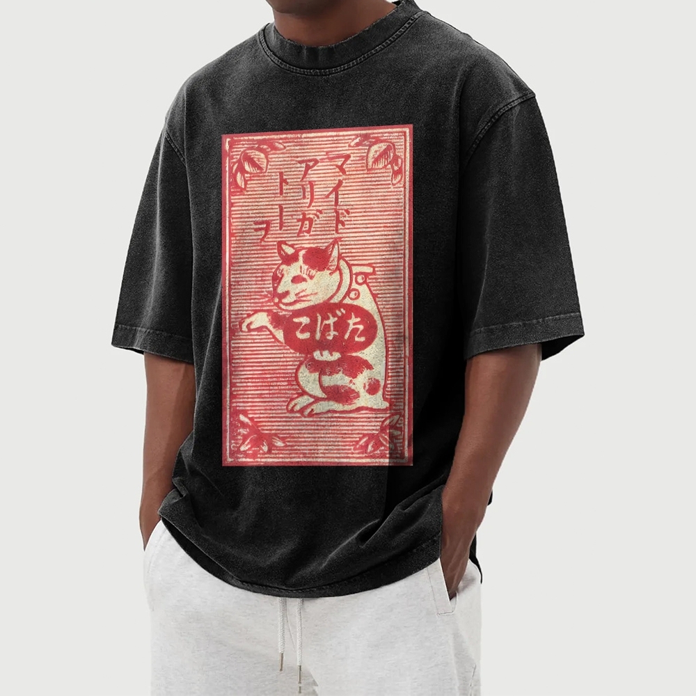 Cat Stamp Pattern Printed Washed Vintage Short Sleeves T-Shirt