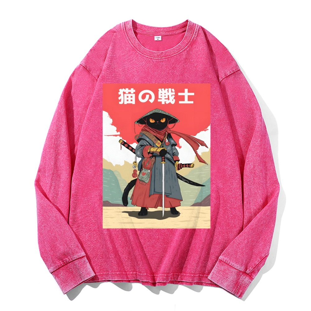 Cat Warrior Pattern Deep Washed Vintage Long Sleeves T-Shirt