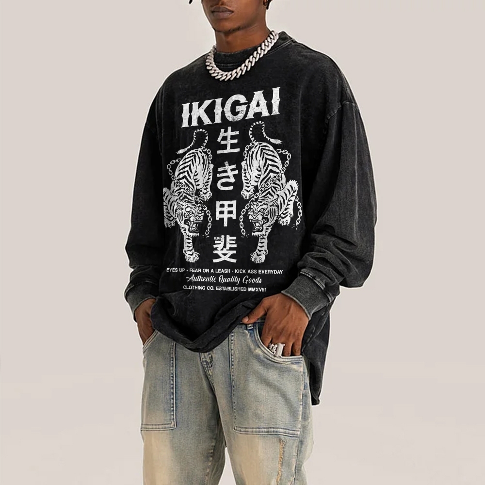 Chain Tiger Pattern Deep Washed Vintage Long Sleeves T-Shirt