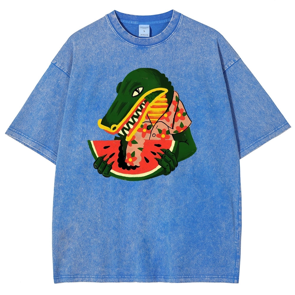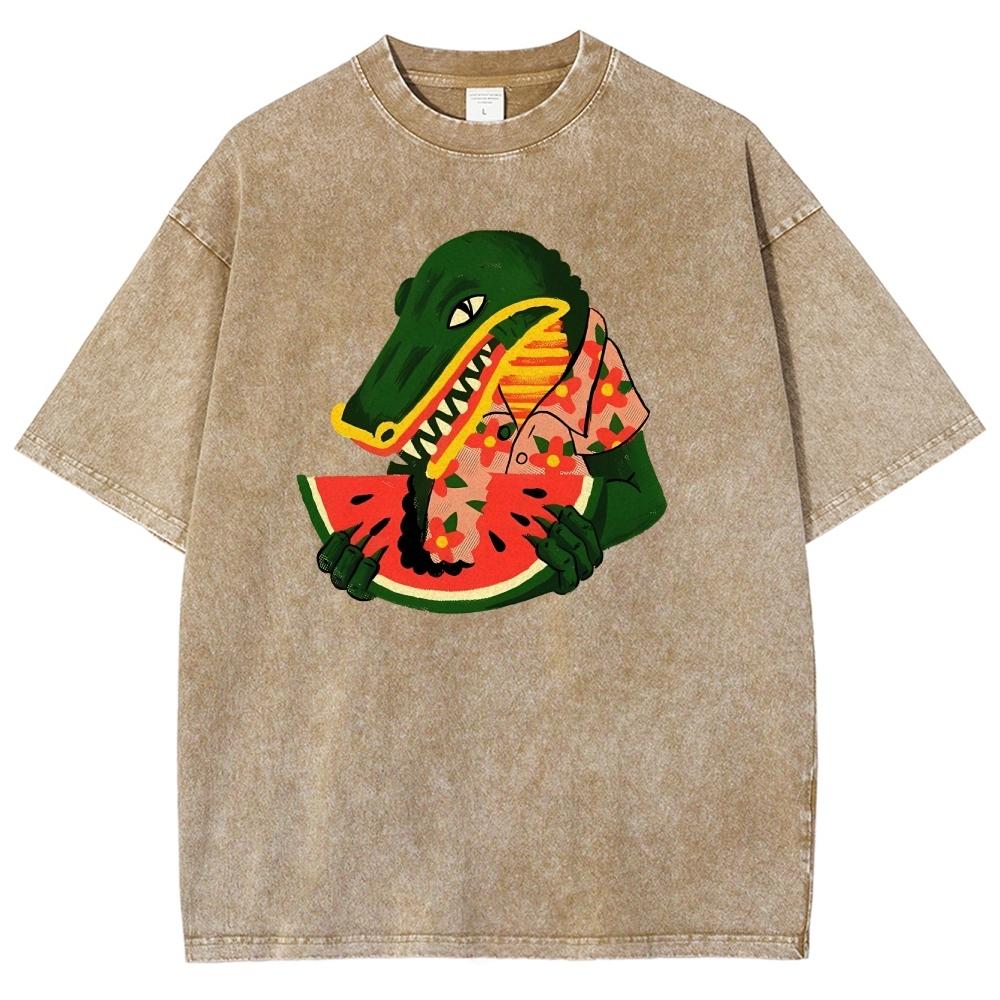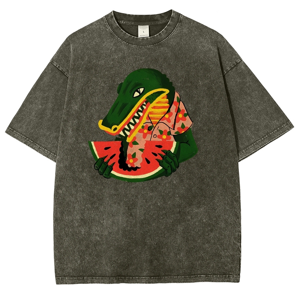 Crocodile Eating Watermelon Washed Printed T-Shirt