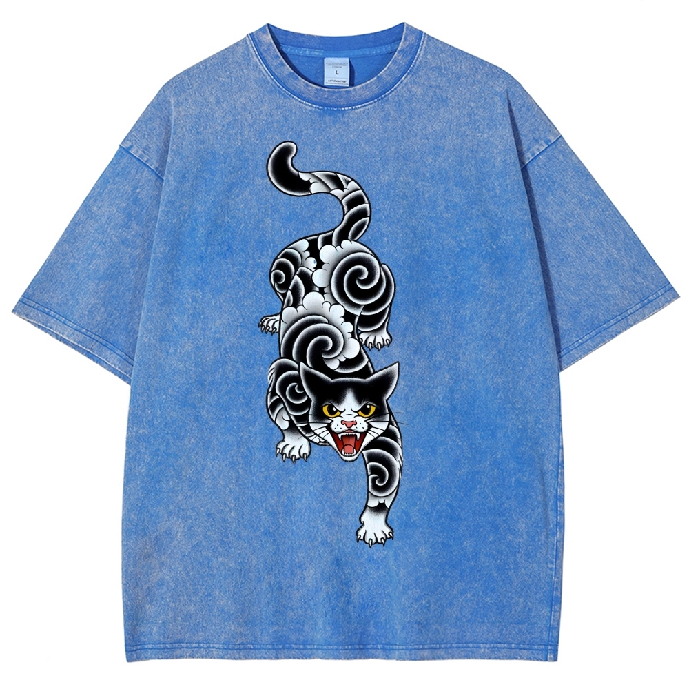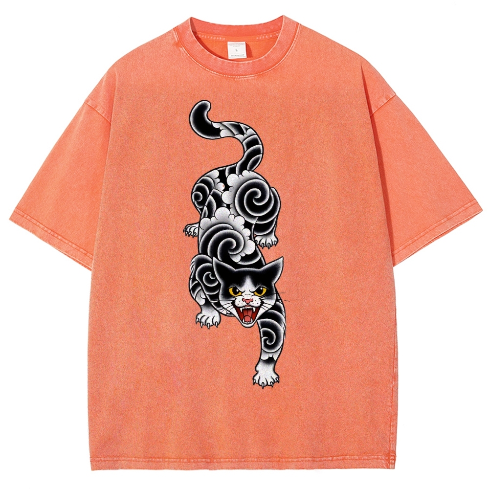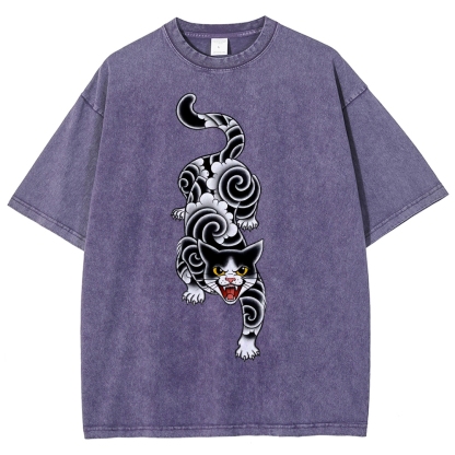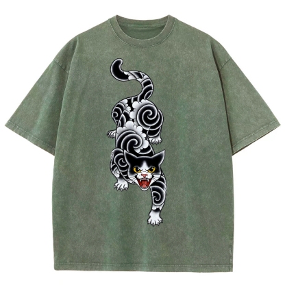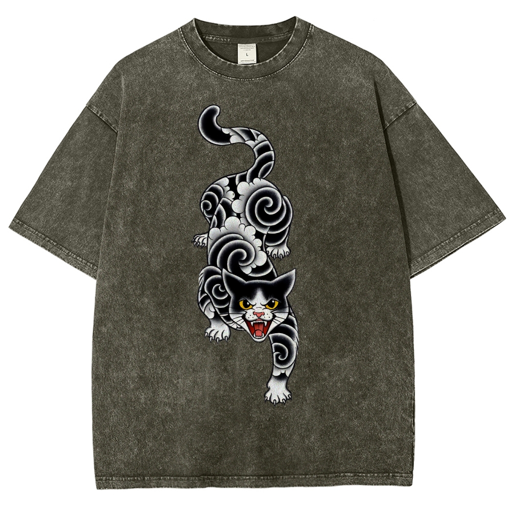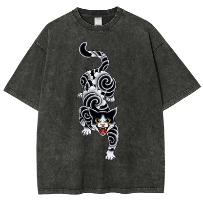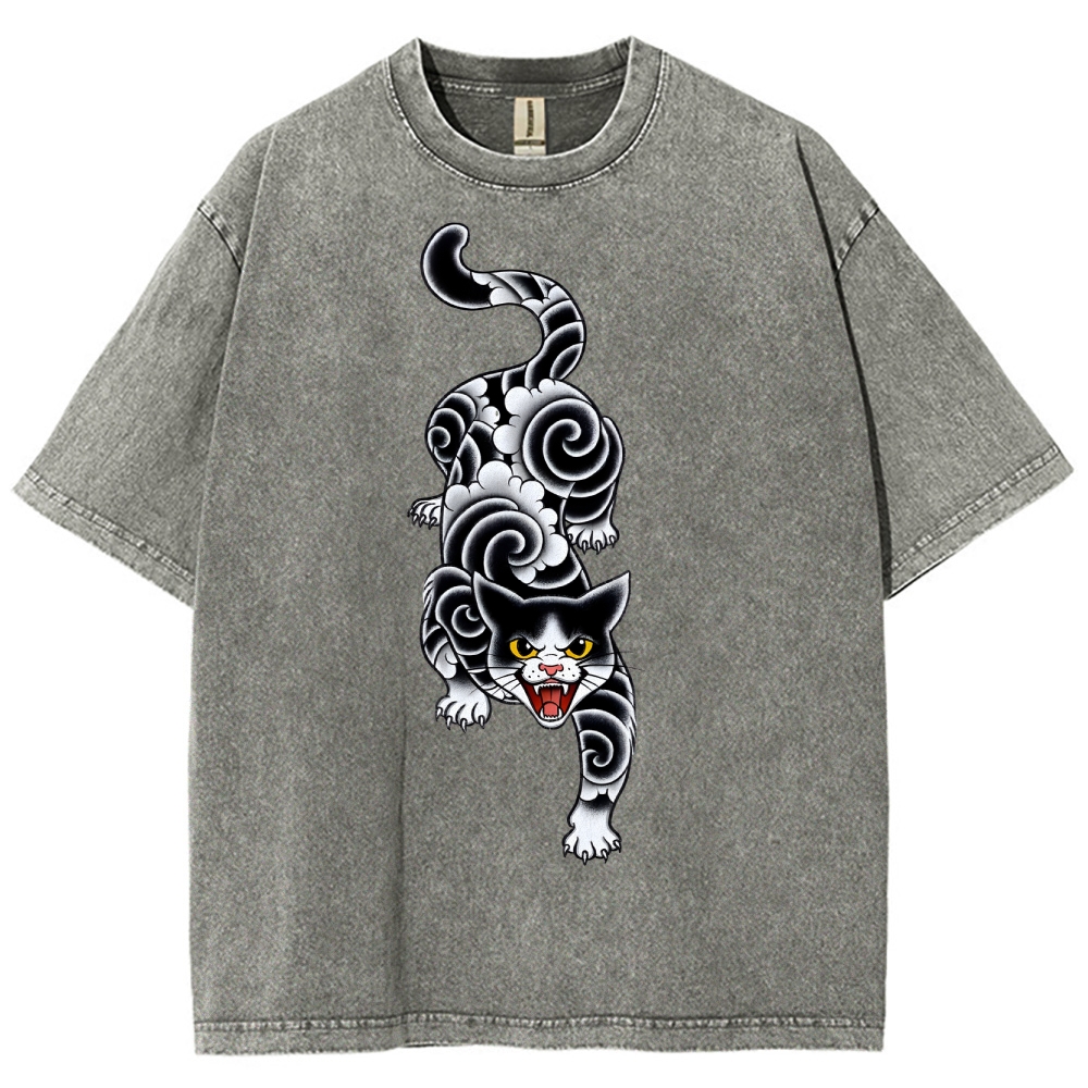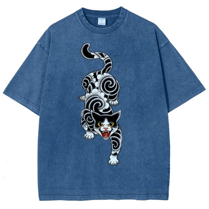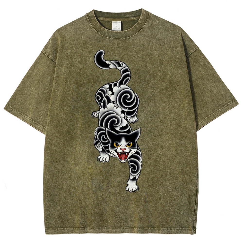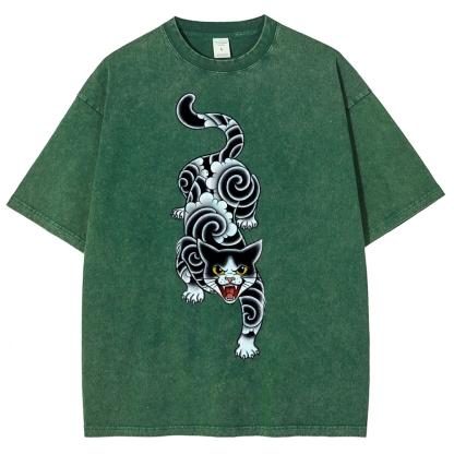 Fierce Cat Pattern Prints Washed Vintage Short Sleeves T-Shirt