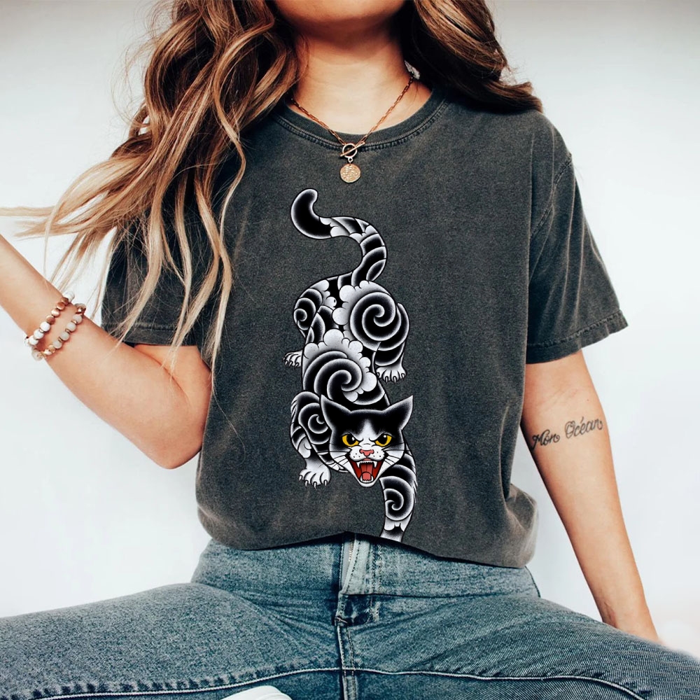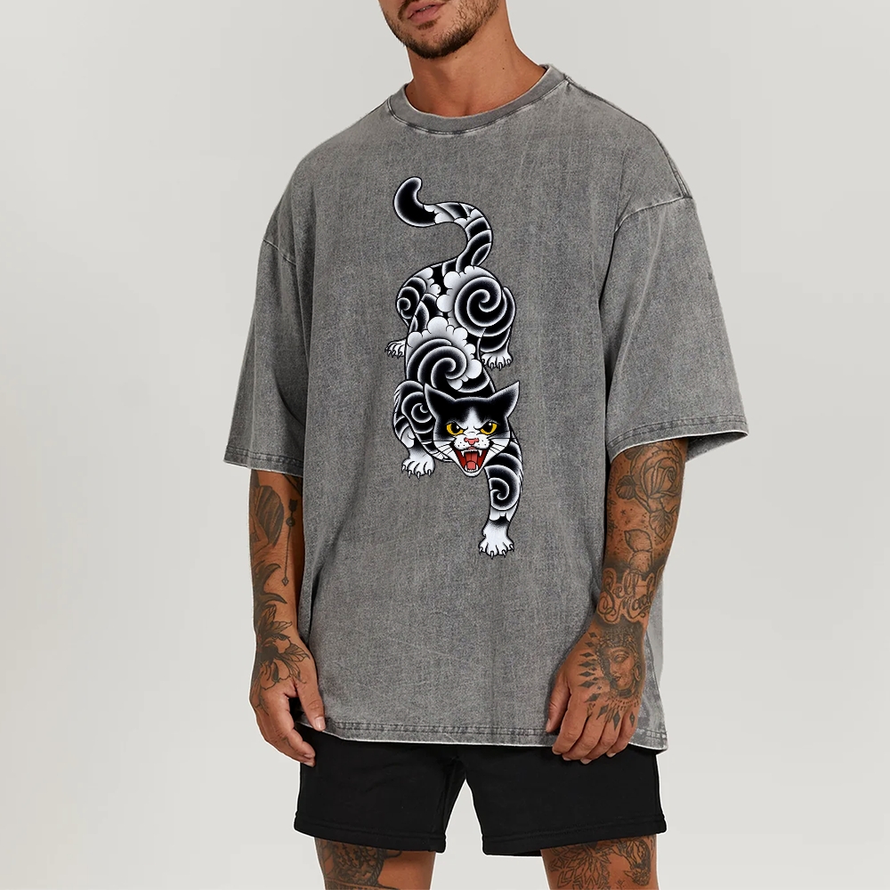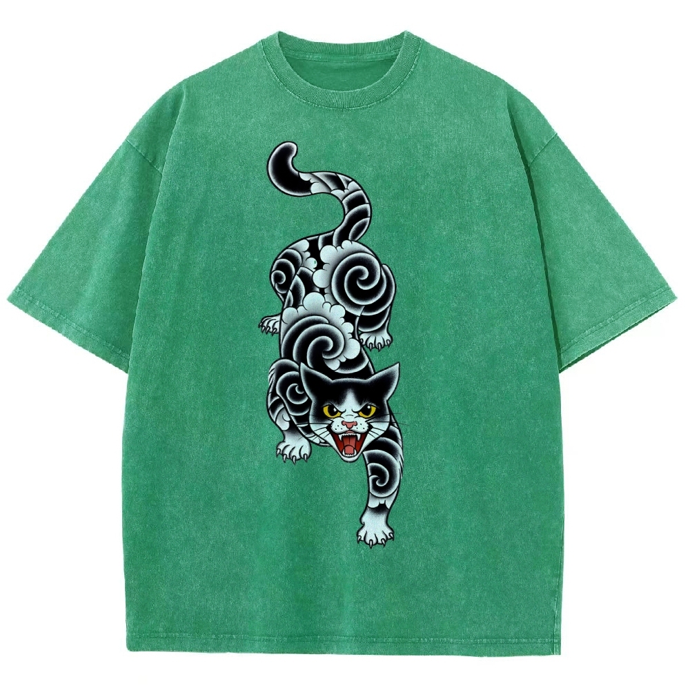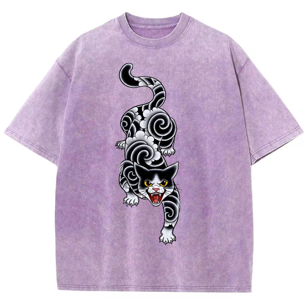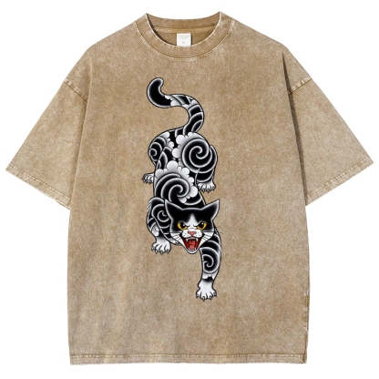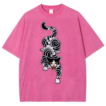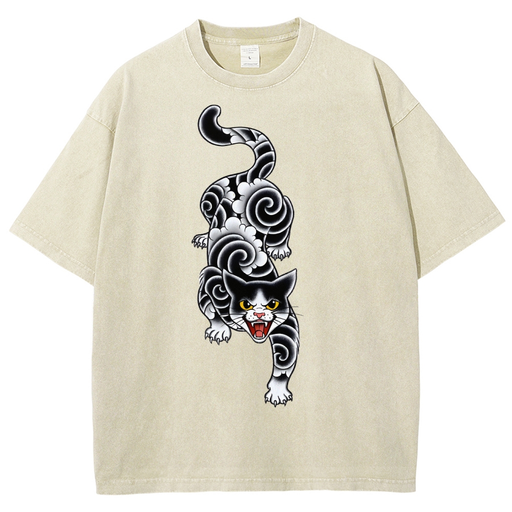 Fierce Cat Pattern Prints Washed Vintage Short Sleeves T-Shirt
