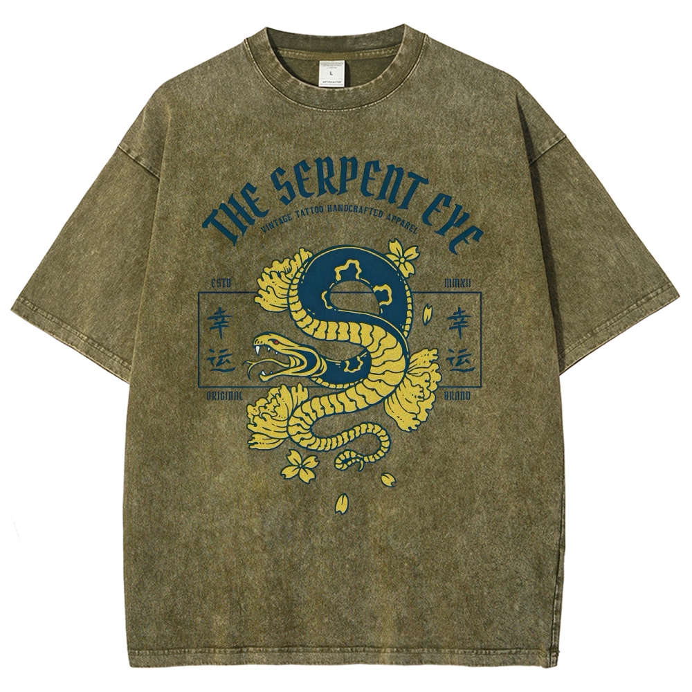 Japan Lucky Snake Sign Washed Vintage Short Sleeves T-Shirt