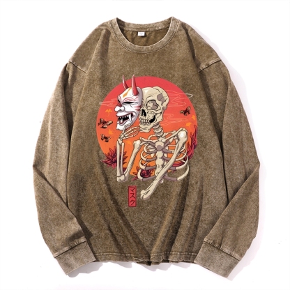 Japanese Skeleton Mask Deep Washed Vintage Long Sleeves T-Shirt