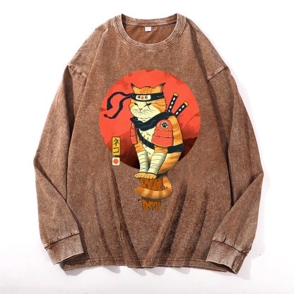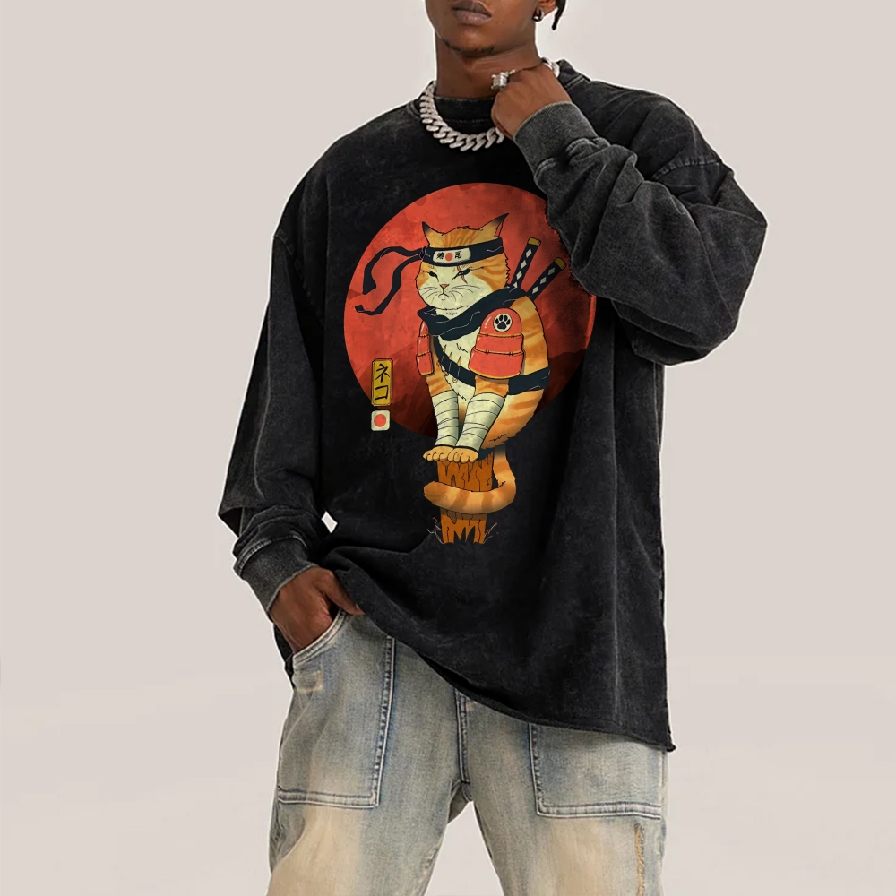 Ninja Sushi Cat Casual Deep Washed Vintage Long Sleeves T-Shirt