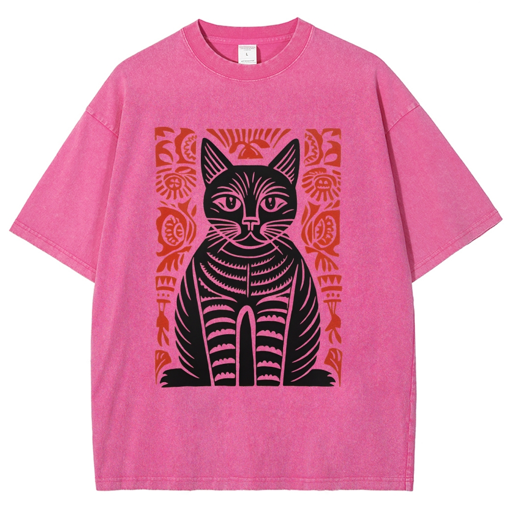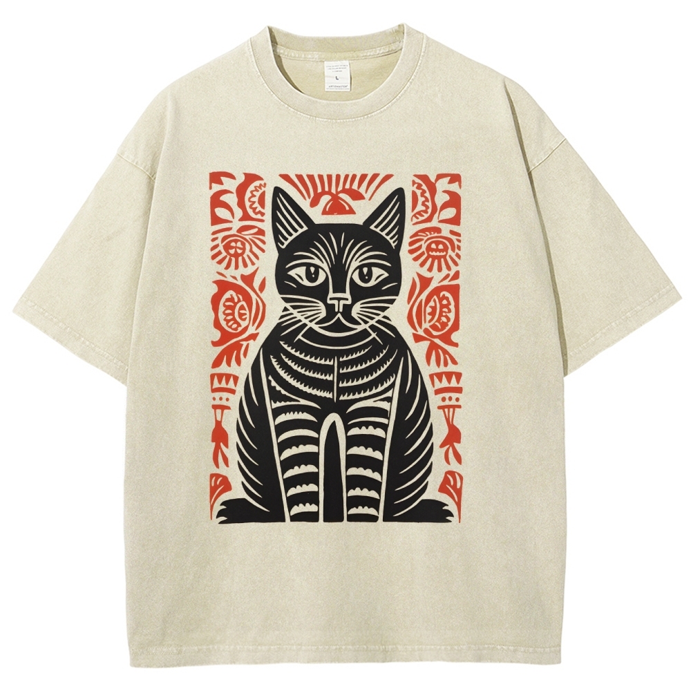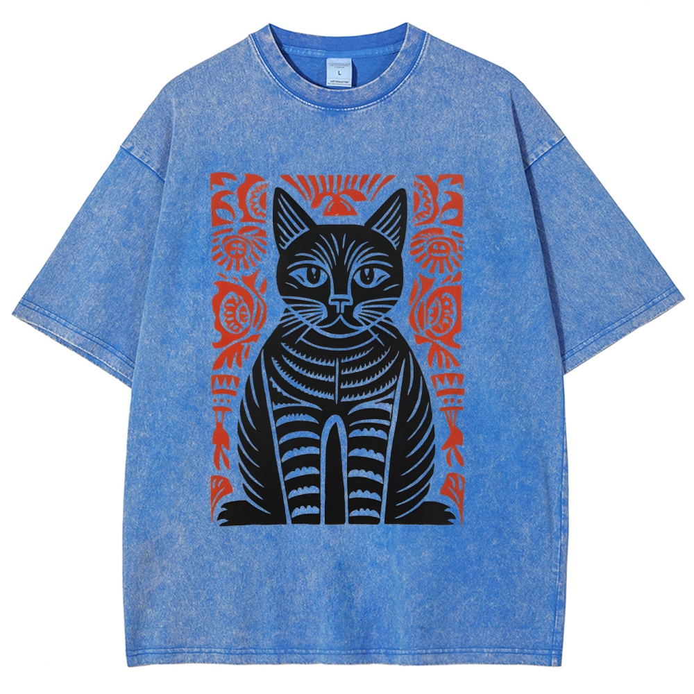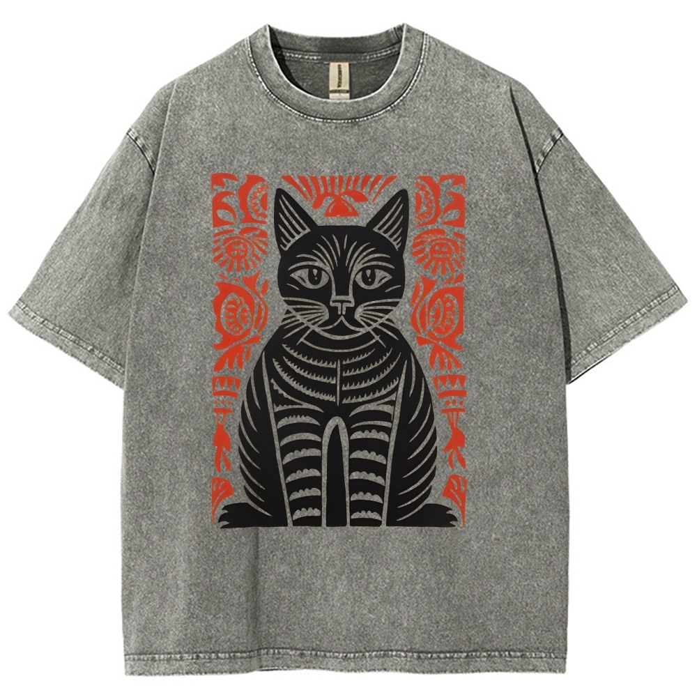 Paper Cutting Cat Prints Washed Vintage Short Sleeves T-Shirt