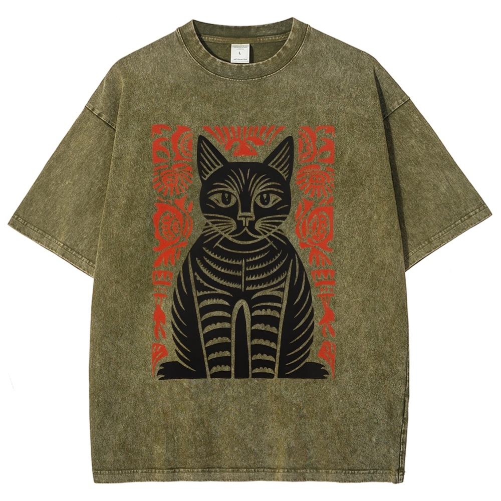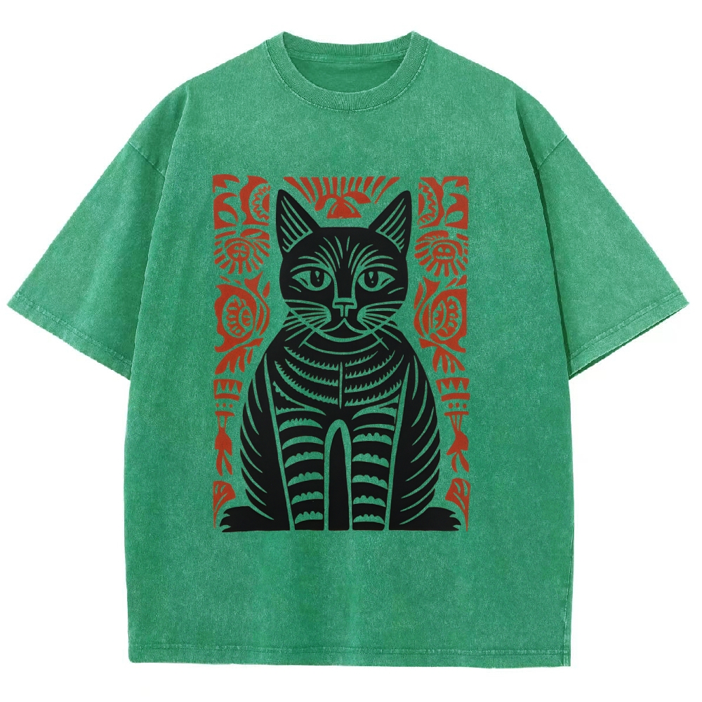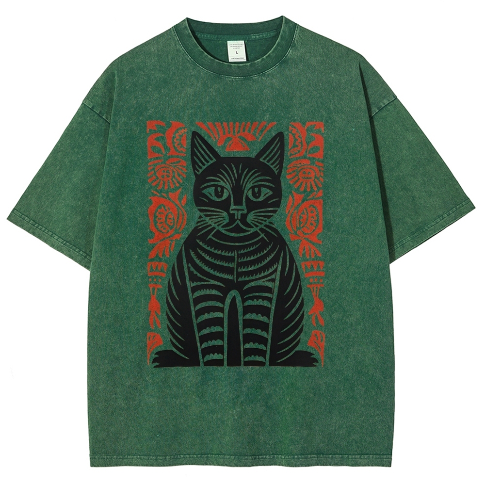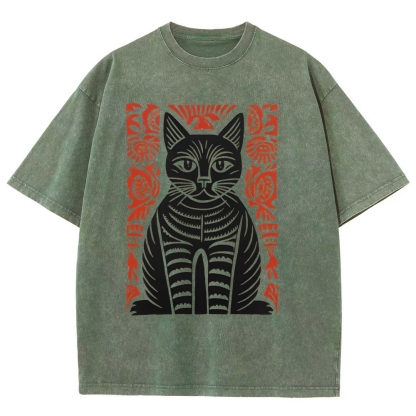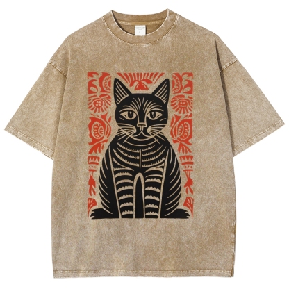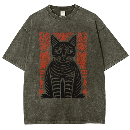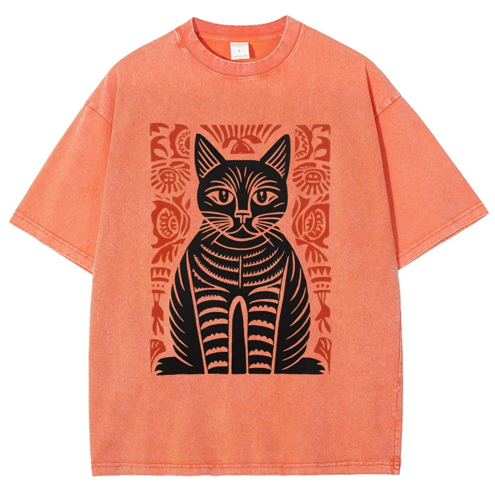 Paper Cutting Cat Prints Washed Vintage Short Sleeves T-Shirt