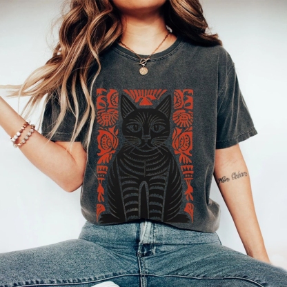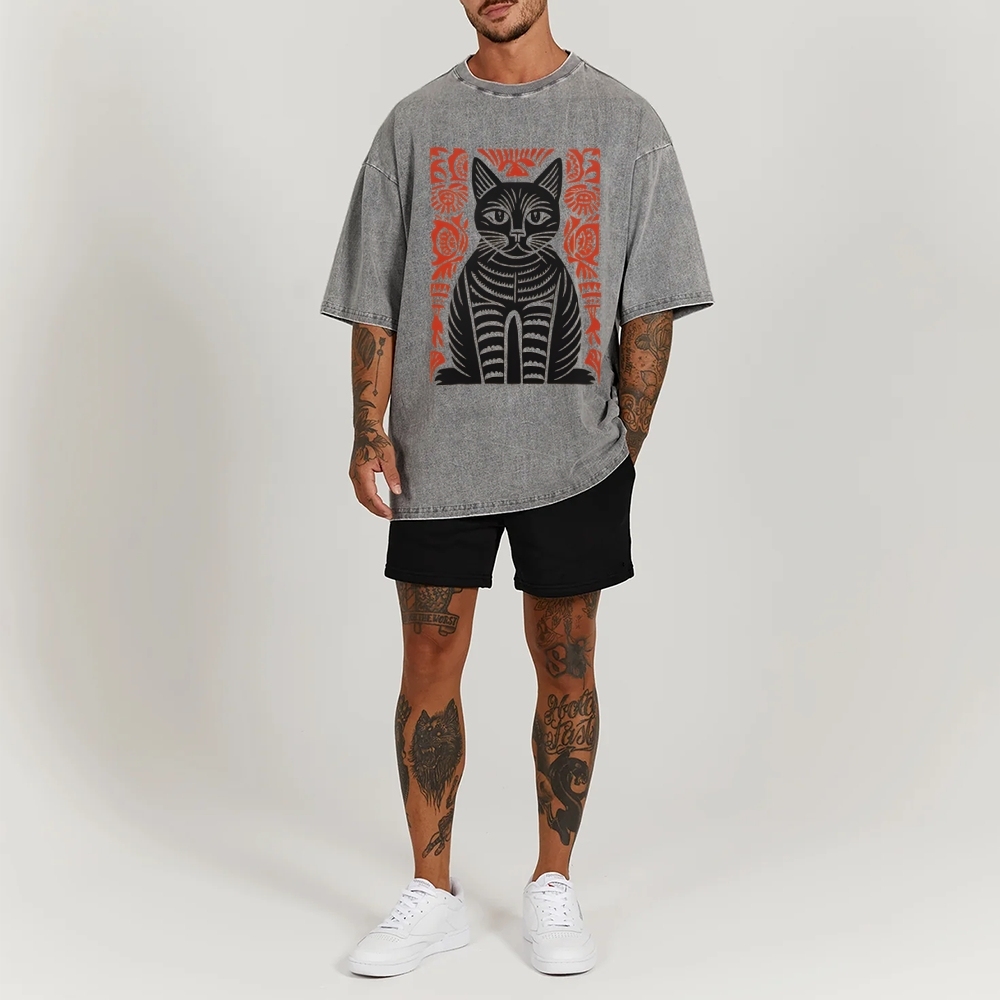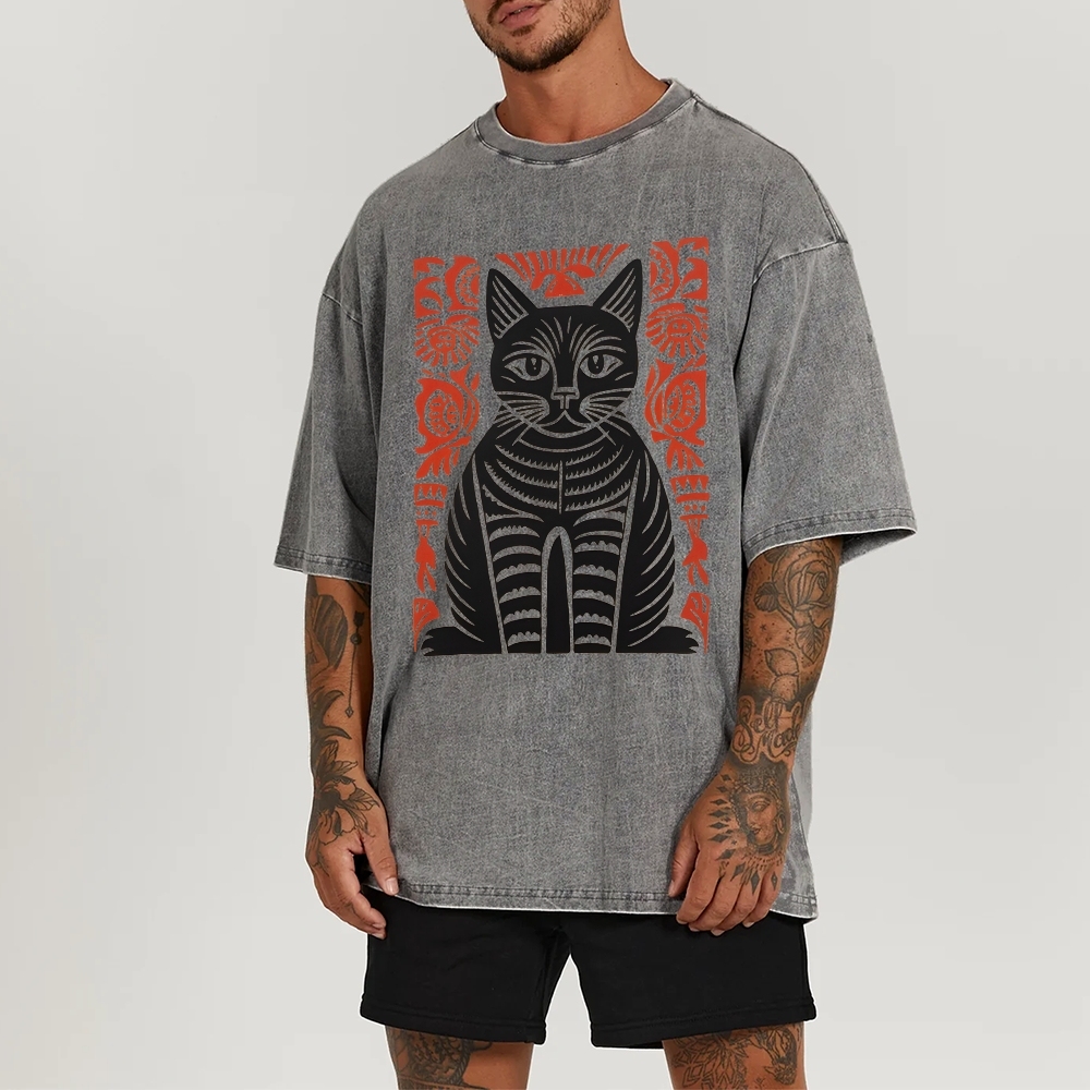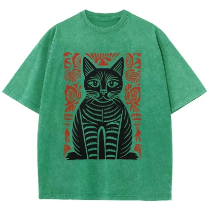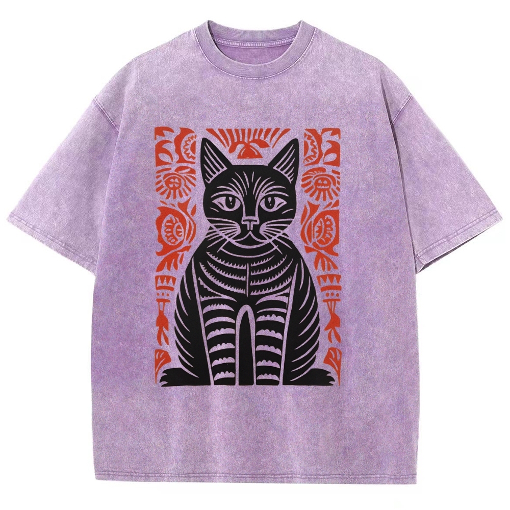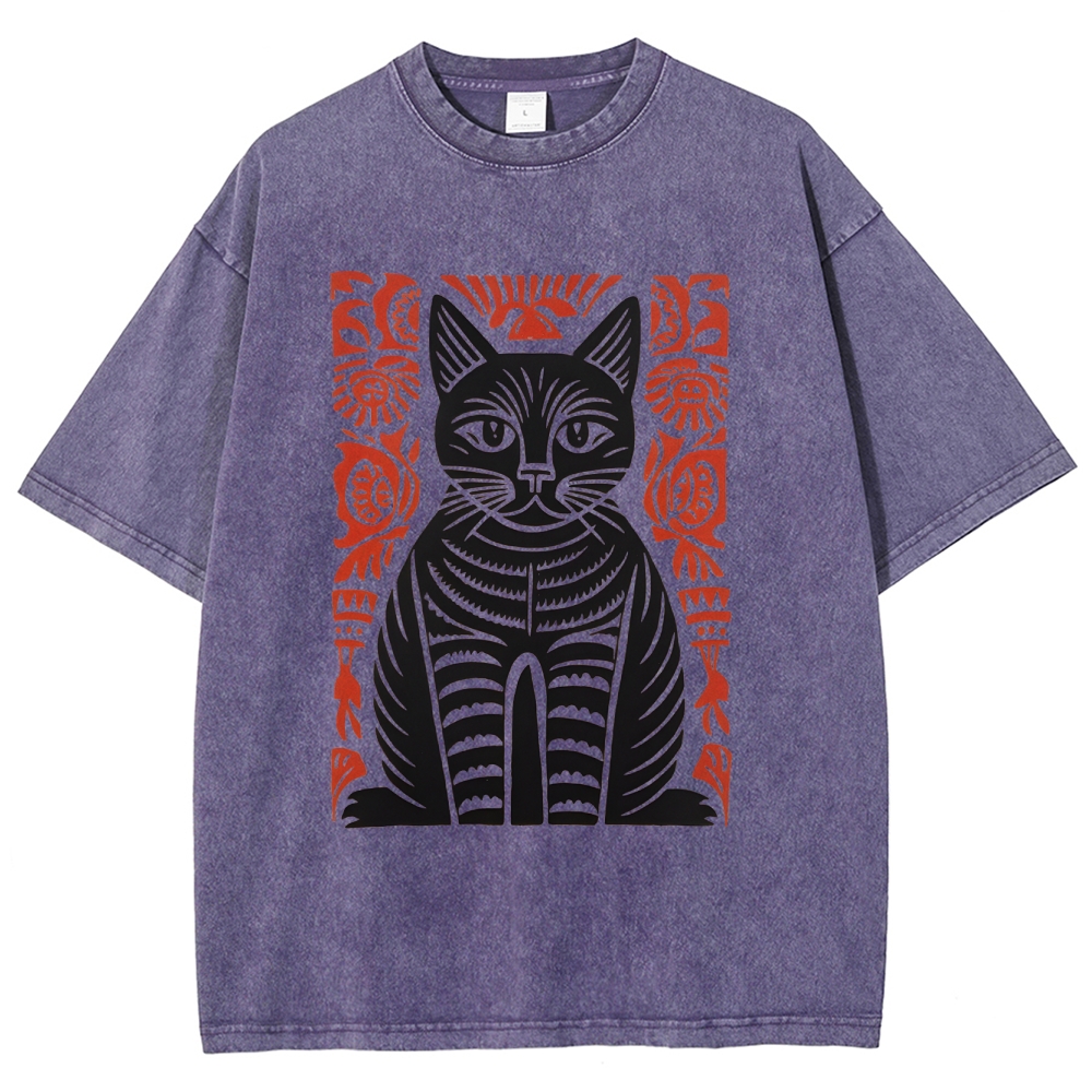 Paper Cutting Cat Prints Washed Vintage Short Sleeves T-Shirt