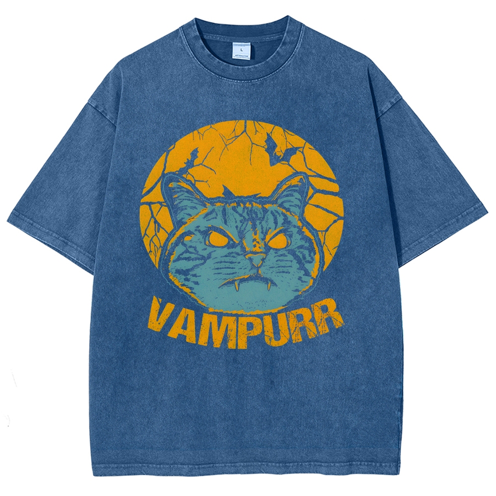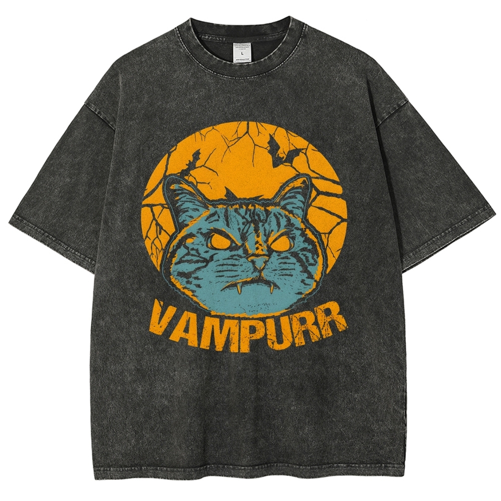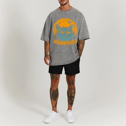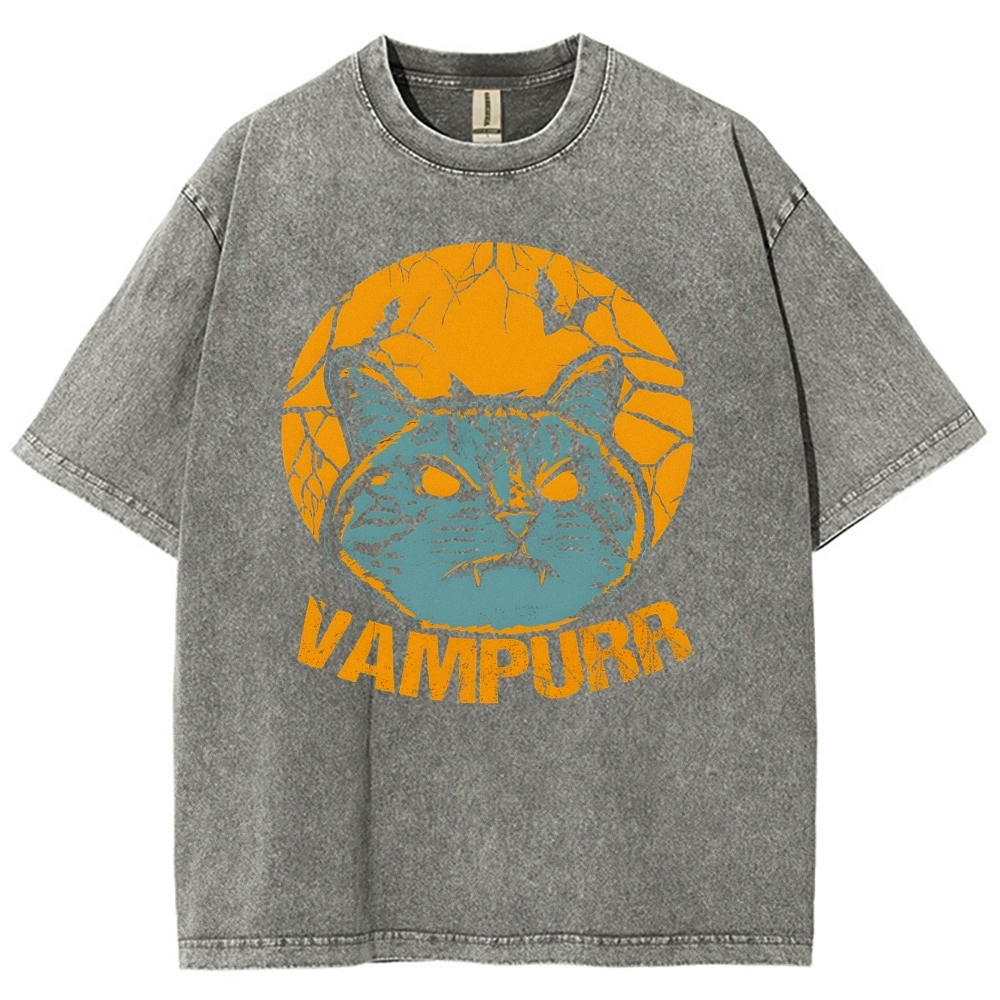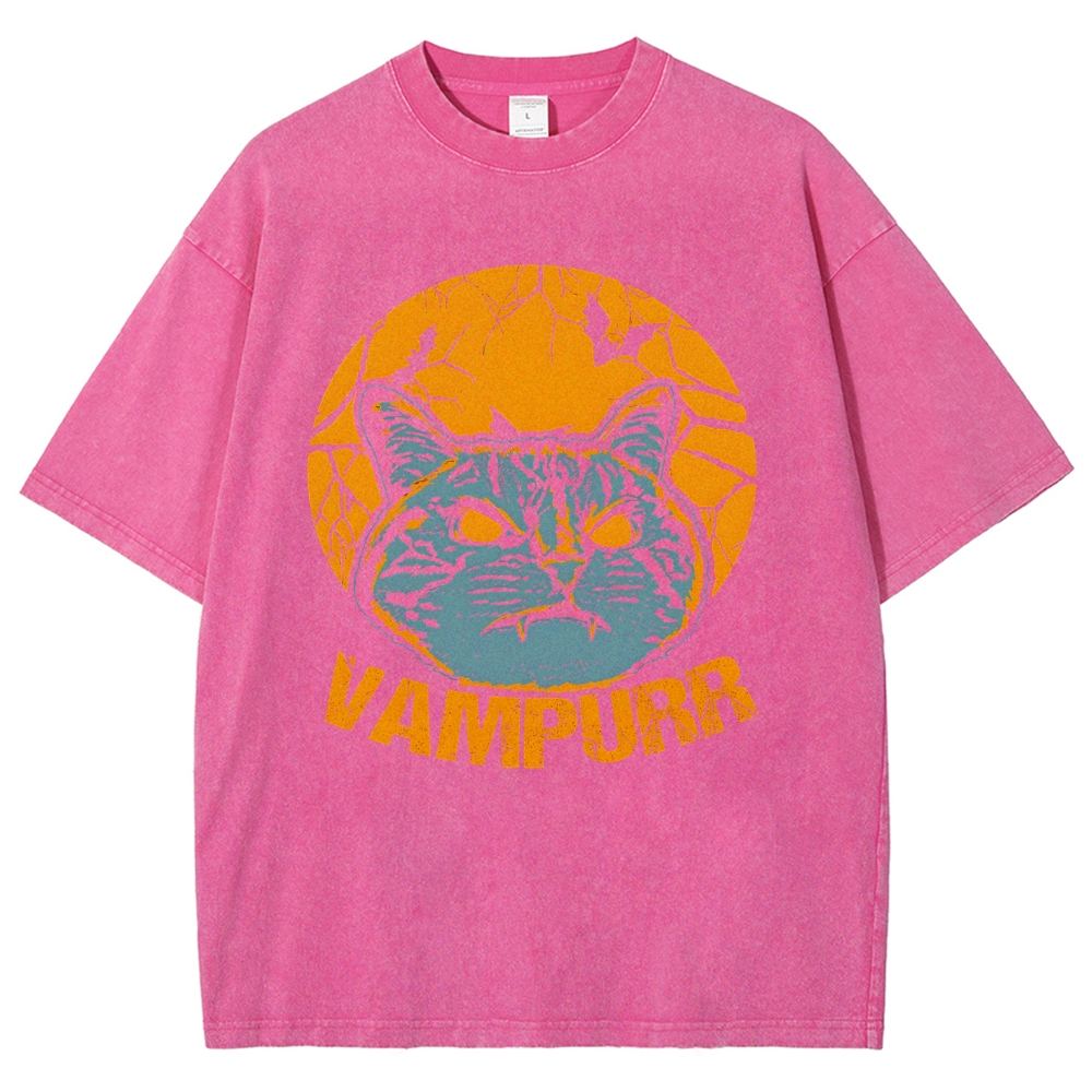 Vampire Cat Pattern Washed Vintage Short Sleeves T-Shirt