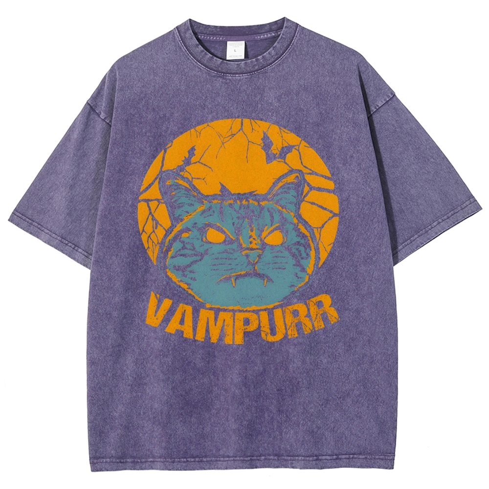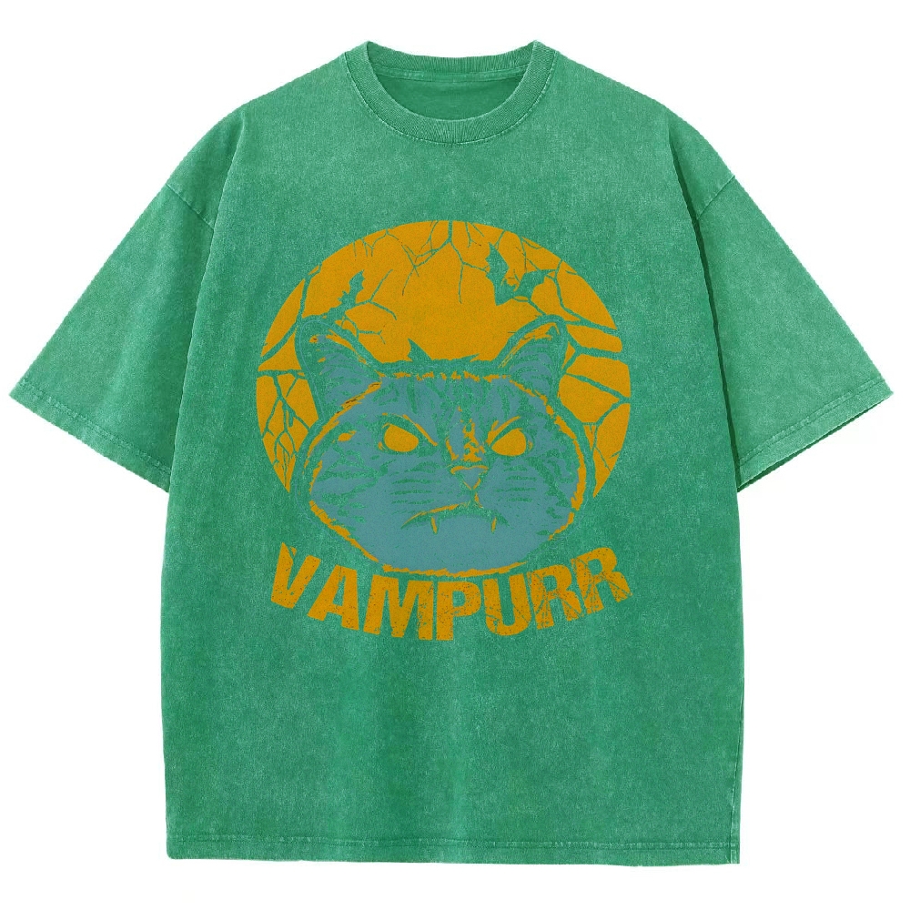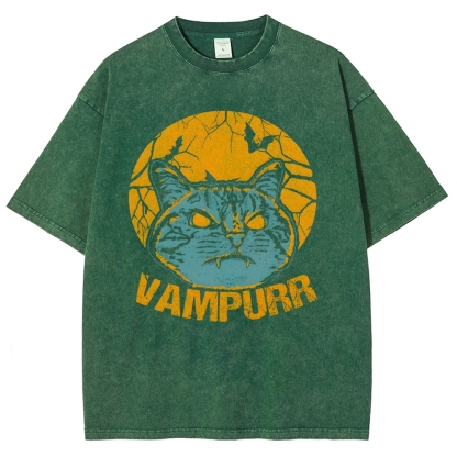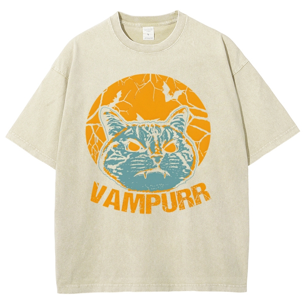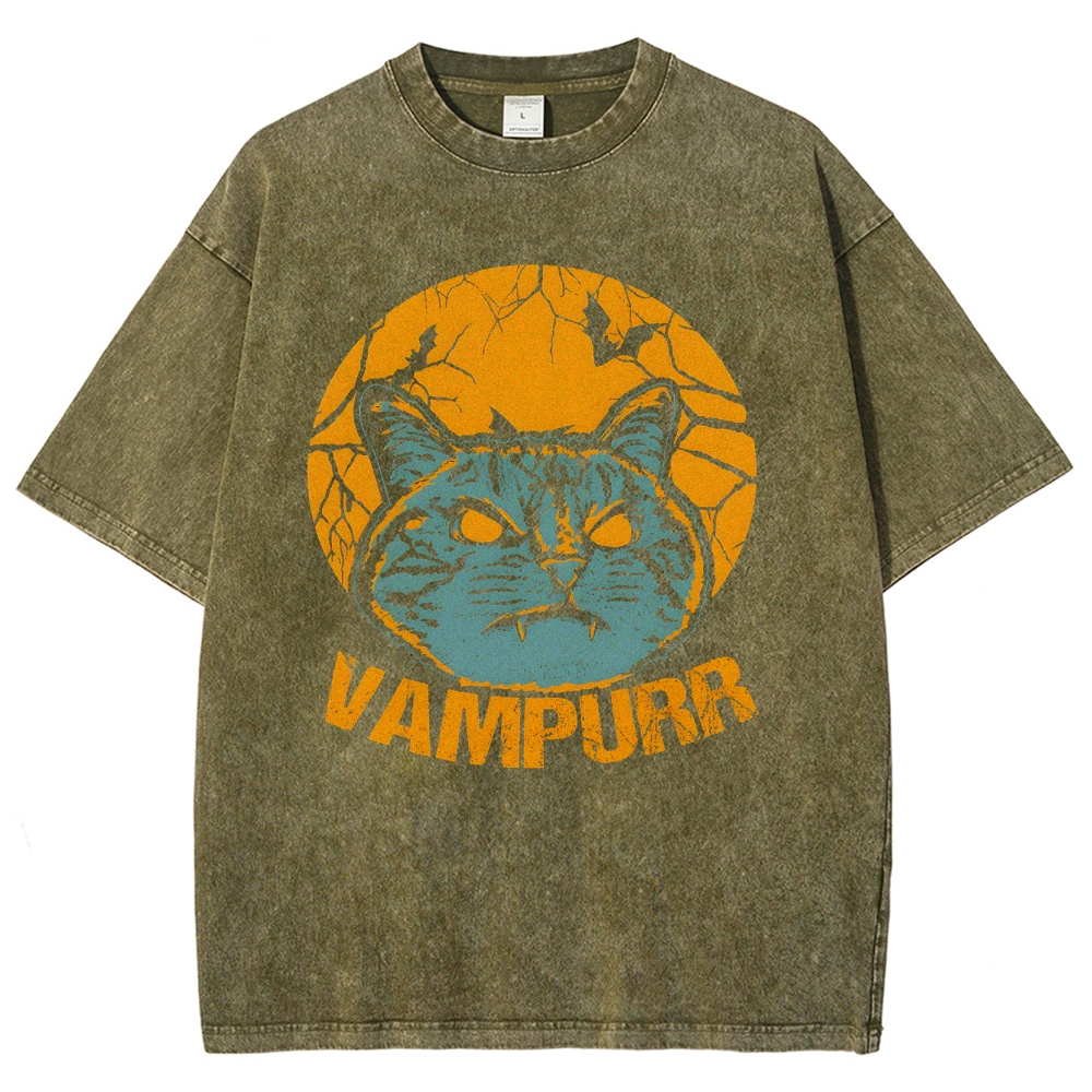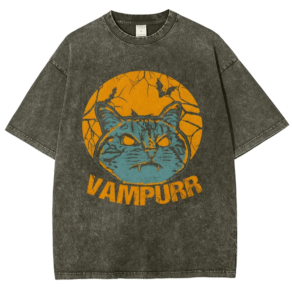 Vampire Cat Pattern Washed Vintage Short Sleeves T-Shirt