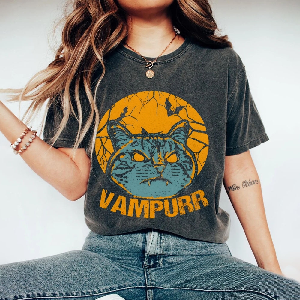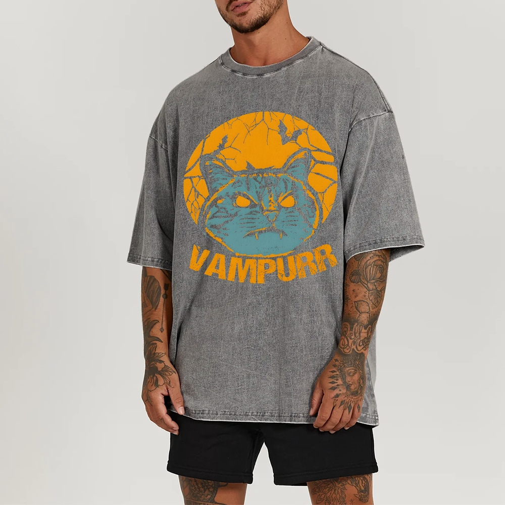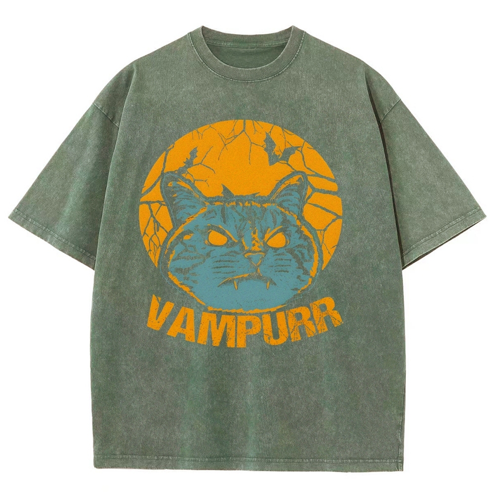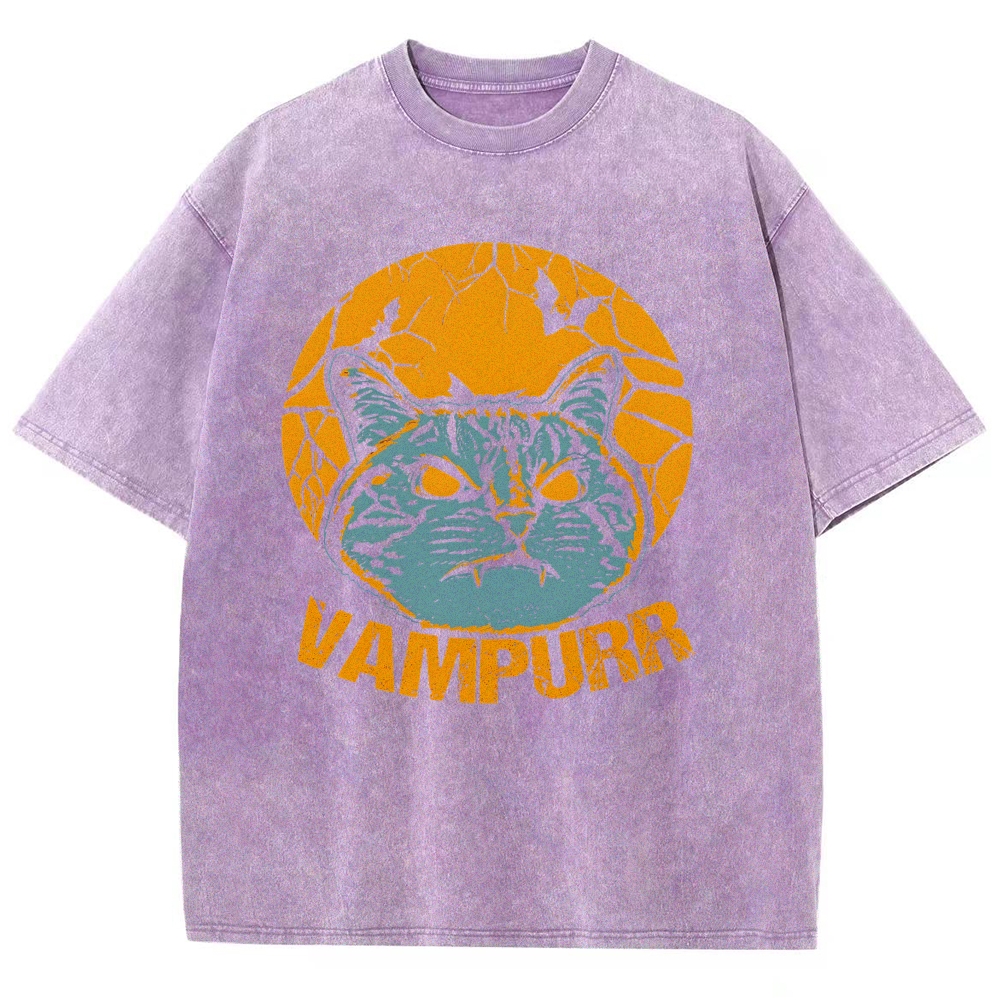 Vampire Cat Pattern Washed Vintage Short Sleeves T-Shirt