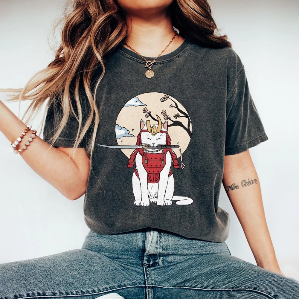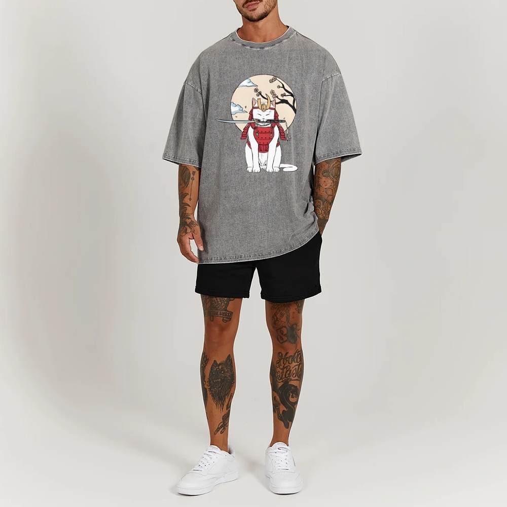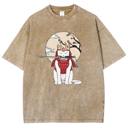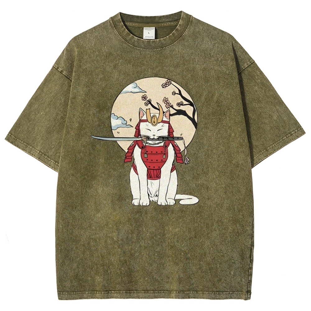 White Cat Warrior Washed Vintage Short Sleeves T-Shirt