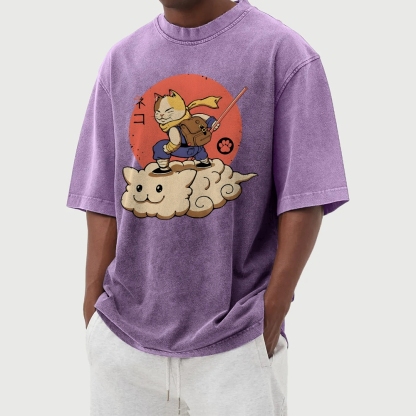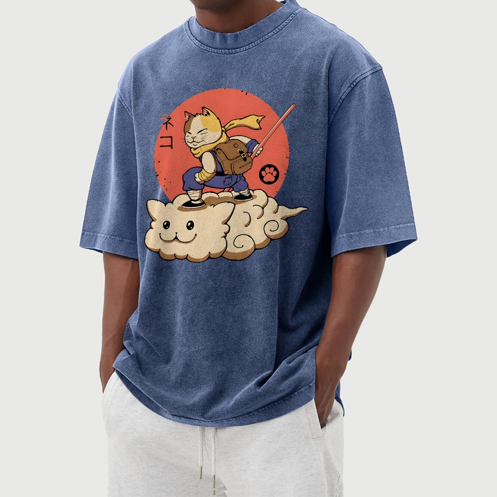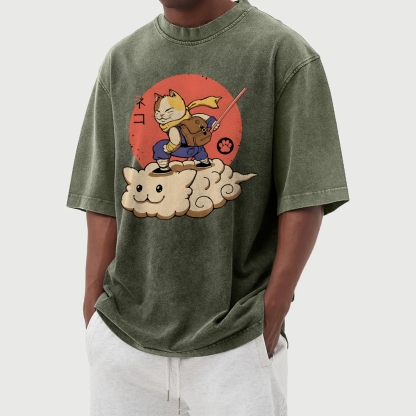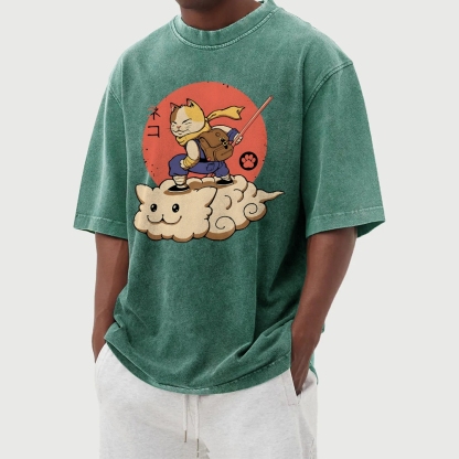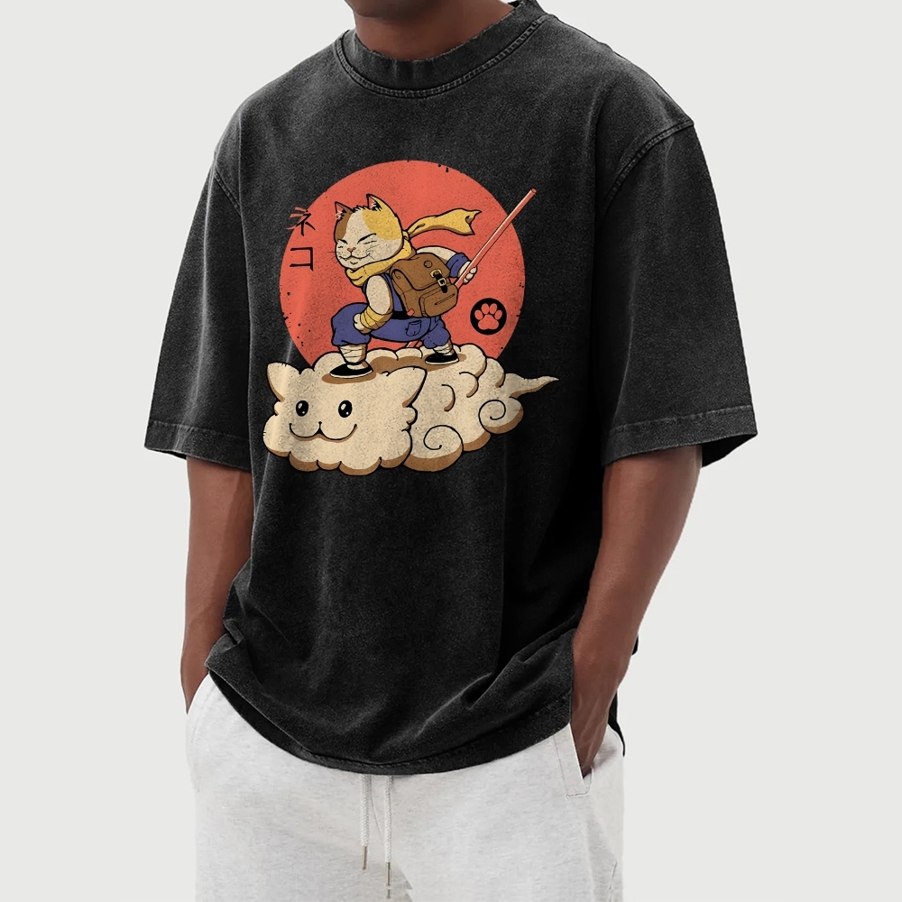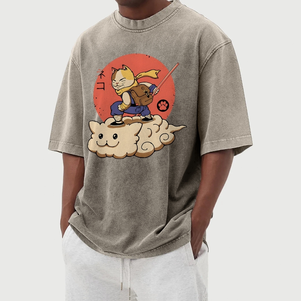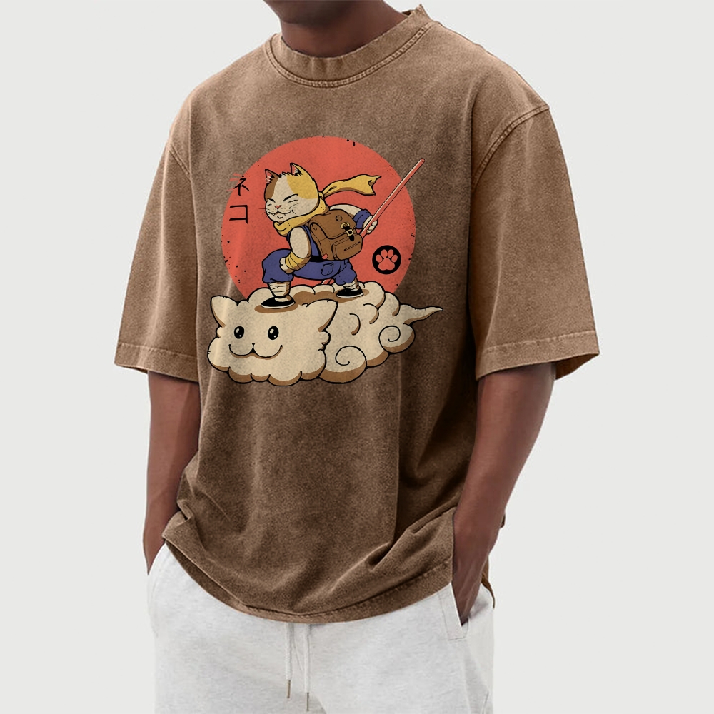 Wukong Cat Pattern Washed Vintage Short Sleeves T-Shirt